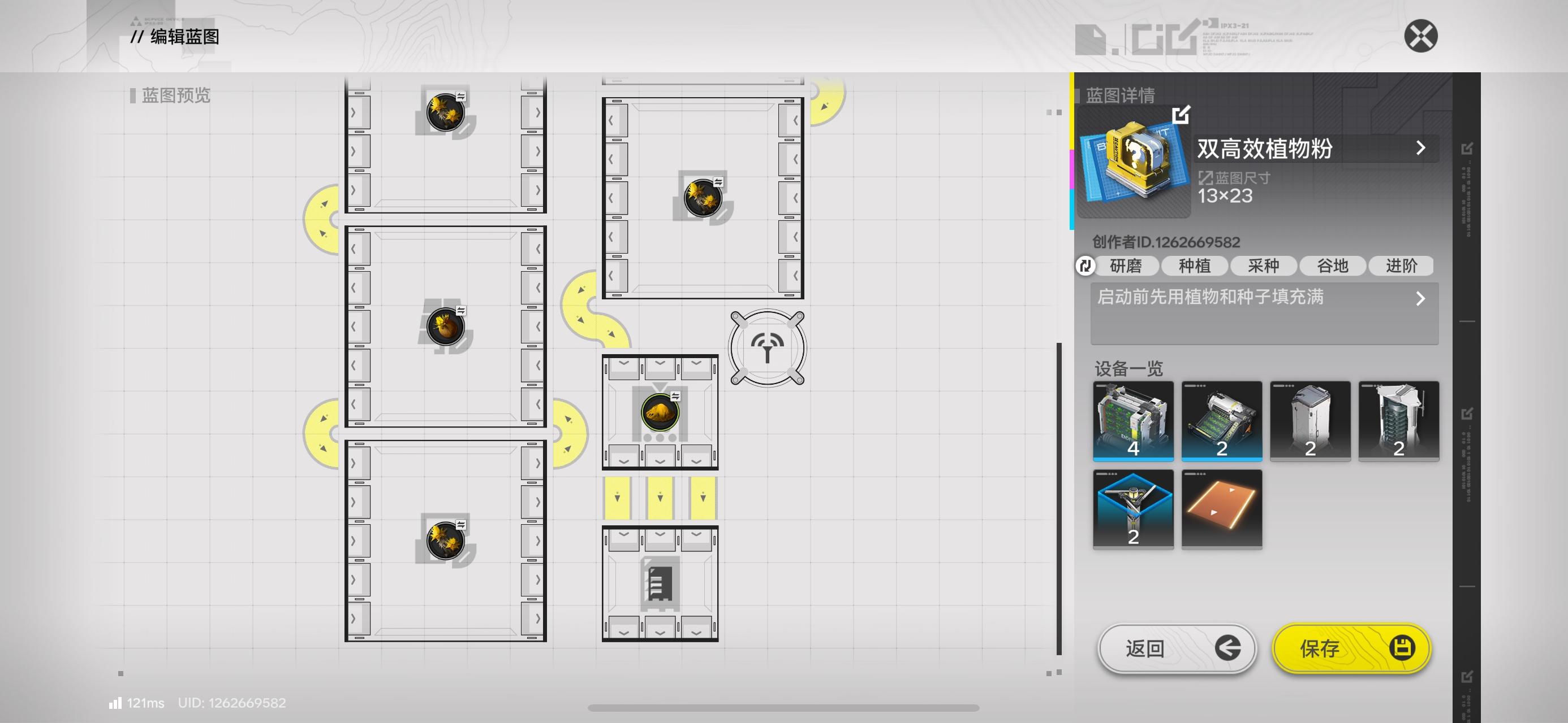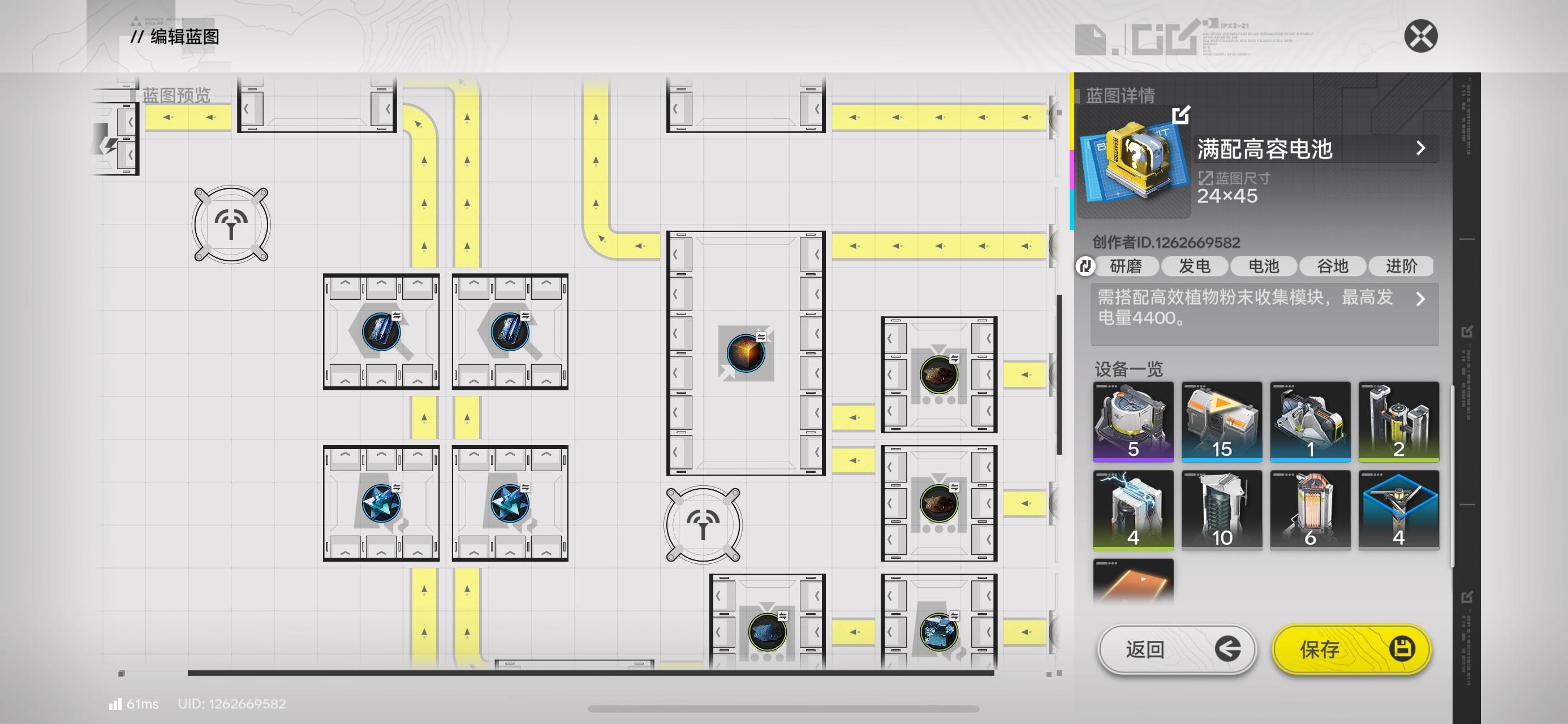 满配高容电池最高4400发电量,需搭配双高效植物粉末收集模块一起建造。《明日方舟:终末地》蓝图分享码 EF01i1UIu7u93297aU4 请复制后前往游戏中使用双高效植物粉末收集模块启动前先填充一些种子植物。《明日方舟:终末地》蓝图分享码 EF014AE69O97035Ea1A 请复制后前往游戏中使用。