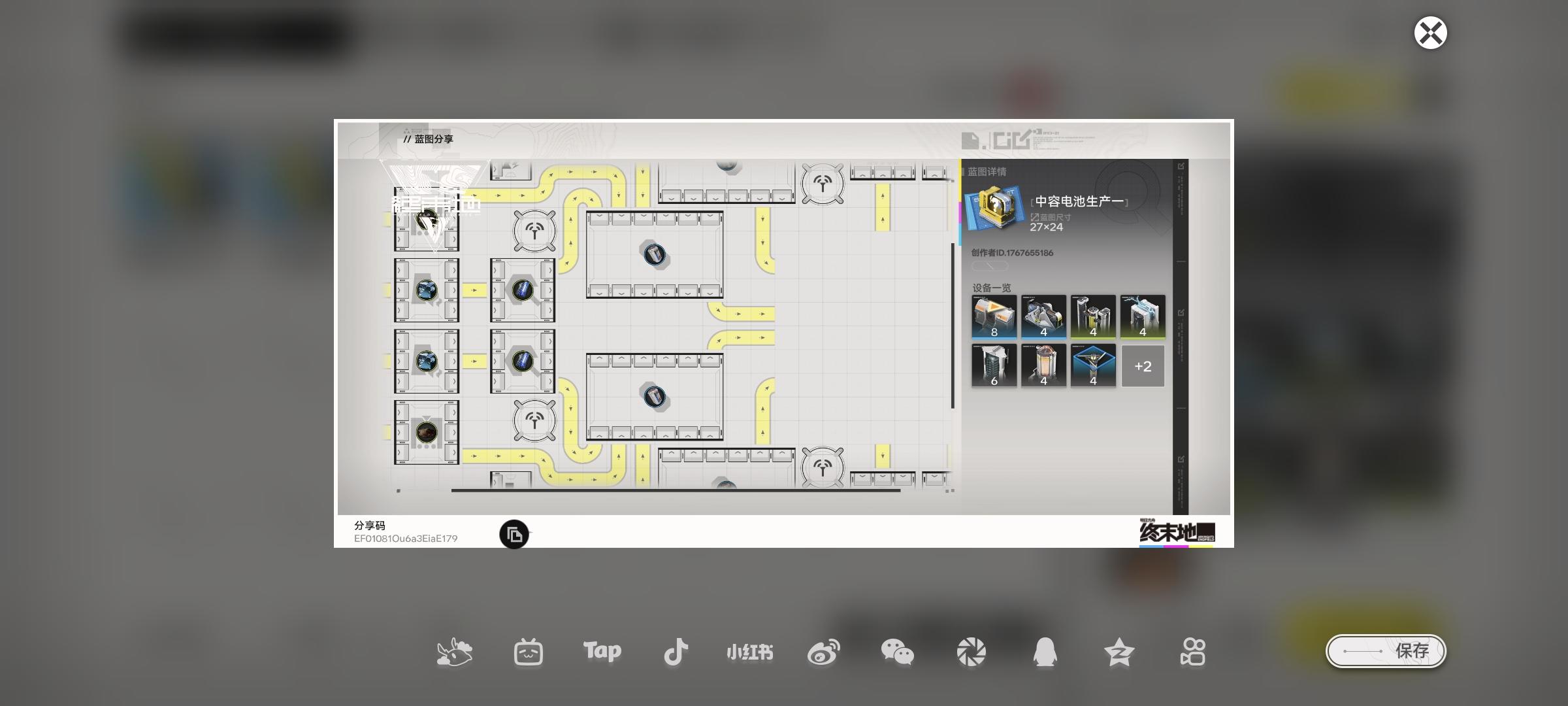 《明日方舟:终末地》蓝图分享码 EF01o5u2UeU3166IieO 请复制后前往游戏中使用。(右上角装备原件和部分药物材料生产) 《明日方舟:终末地》蓝图分享码 EF01u28OeAeo90a6AoOU 请复制后前往游戏中使用。(枢纽区右中间药物和装备原件生产) 《明日方舟:终末地》蓝图分享码 EF018OI4A7Aua122UI73 请复制后前往游戏中使用。(最下面种植) 《明日方舟:终末地