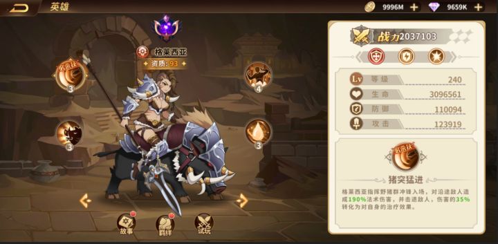 今天给大家介绍一下汗族,也称蛮族的6位神话英雄。格莱西亚:战士定位,承伤、爆发。格莱西亚斯是一位半肉但能打出爆发输出的英雄。一、二技能都能造成180%的伤害输出,三技能每损失生命值上限9%的生命值,攻击力和防御力都可以提升6%,越战越勇,越打越难打。大招猪突猛进可召唤出一群猪,对沿途敌人造成190%的法术伤害,并且伤害的35%还能转化为自身的治疗效果,一场战斗下来她打出的输出会比主c还高,承伤