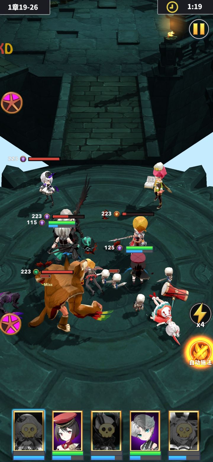 使用此阵容、站位、角色数据打1-19-26会卡死在图二处,只得强制重启。调整任意两个角色站位,更换任一角色或给任一角色升级换装等,都不会引发卡死,唯使用此阵容、此站位、此角色数据运行战斗,会卡死在此处。