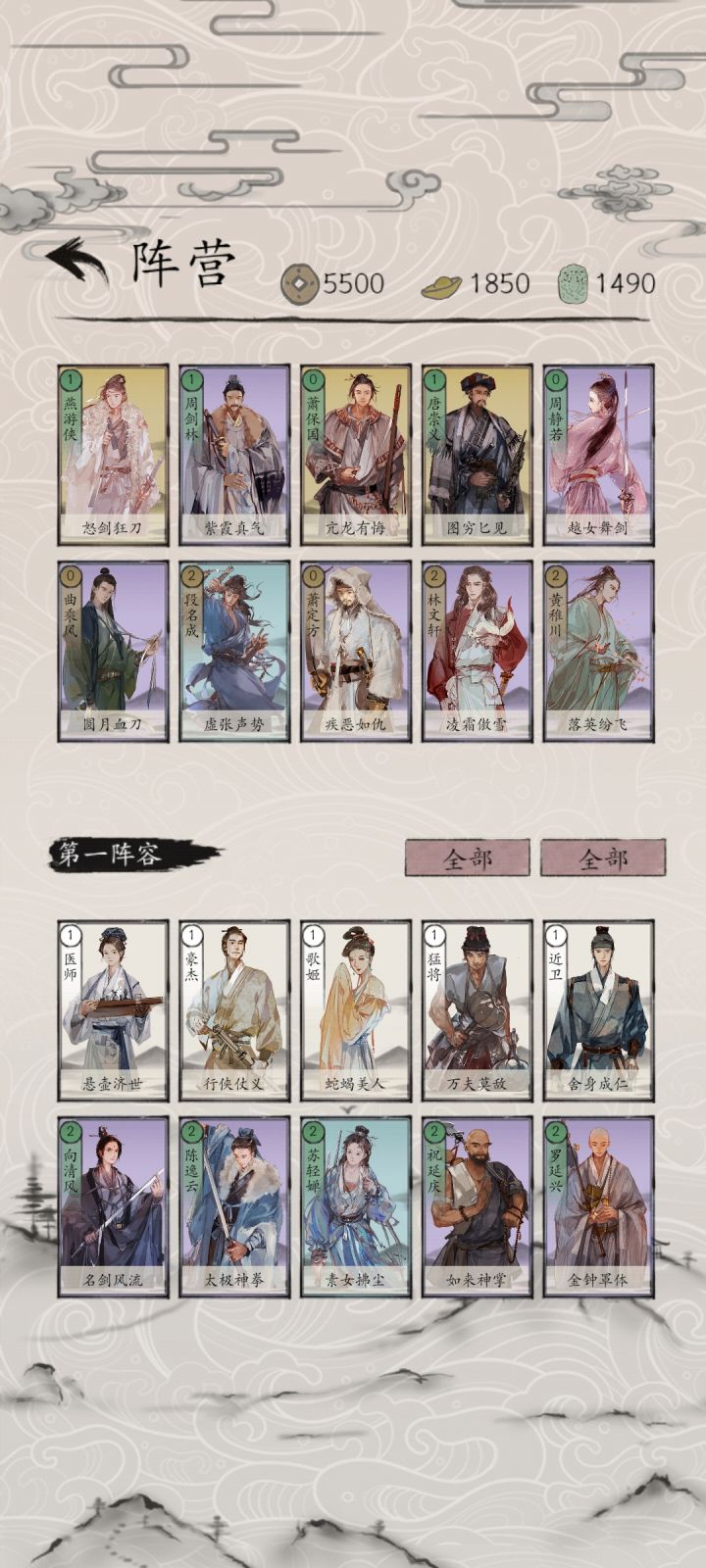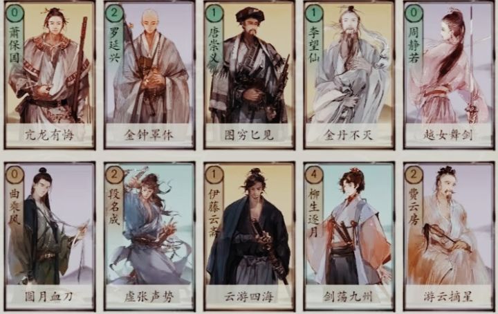 【通关卡组】叶紫芝、顾芸萱、程玄素、赵霓裳、史存孝、雷奉宣、金良玉、颜寿民、叶玄真、柳怜玉。【快攻江湖】叶紫芝、顾芸萱、秋灵凤、张朝山、曲乘风、秦艳娘、伊藤云斋、柳生逐月、叶玄真、柳怜玉。【中速江湖】叶紫芝、顾芸萱、伊藤云斋、柳生逐月、叶玄真、柳怜玉、许君羡、史存孝、金良玉、程玄素。