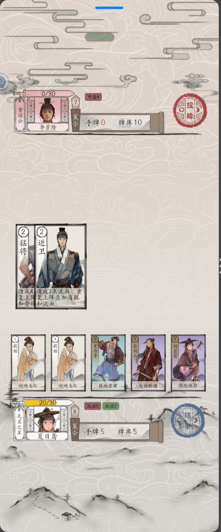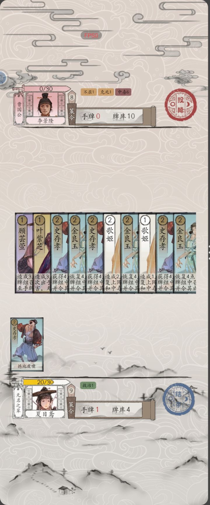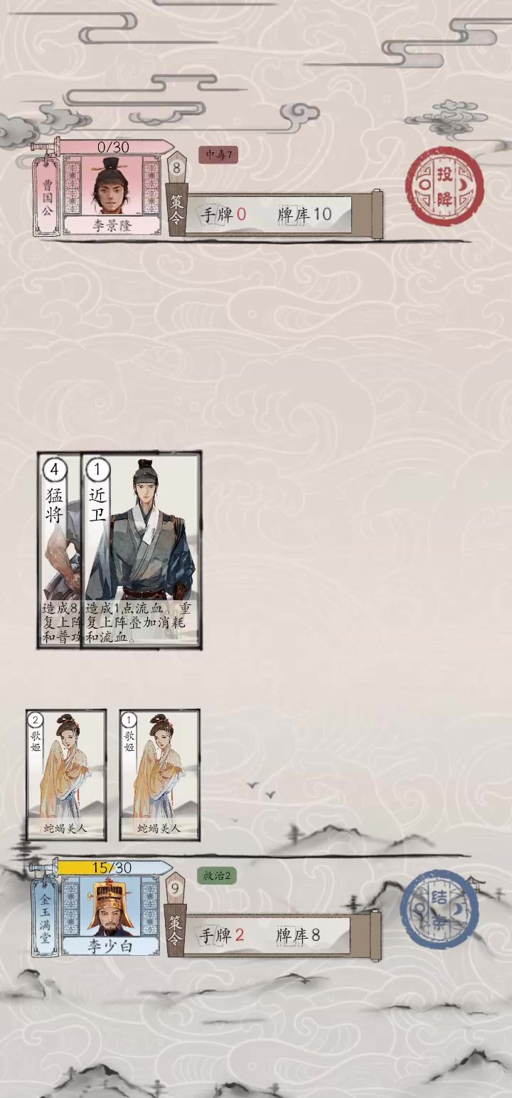 这一关进行到这一回合的时候,无法出牌与结束回合,只能投降不知道是不是对面无敌之后被毒死了导致的bug