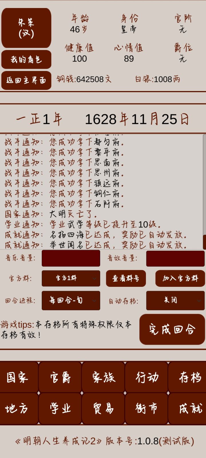 玩这个游戏,先把那个武学或者文学弄到10级,之后呢,就随机选一个官职,之后搞一个初级管家(有条件的可以弄一个高级管家,这样就不用你自己买粮食了),先保证一下家人的健康值(初级管家话费的钱是家族的,所以有时候要往家族里存点钱),土地用处不大,可以把土地卖了,之后呢,再买多点粮食,接下来就点那个完成回合,我建议每过两个月处理一下,不然等你的那个到10个后会被降职,所以两下比较妥善,之后定时给家族买点粮