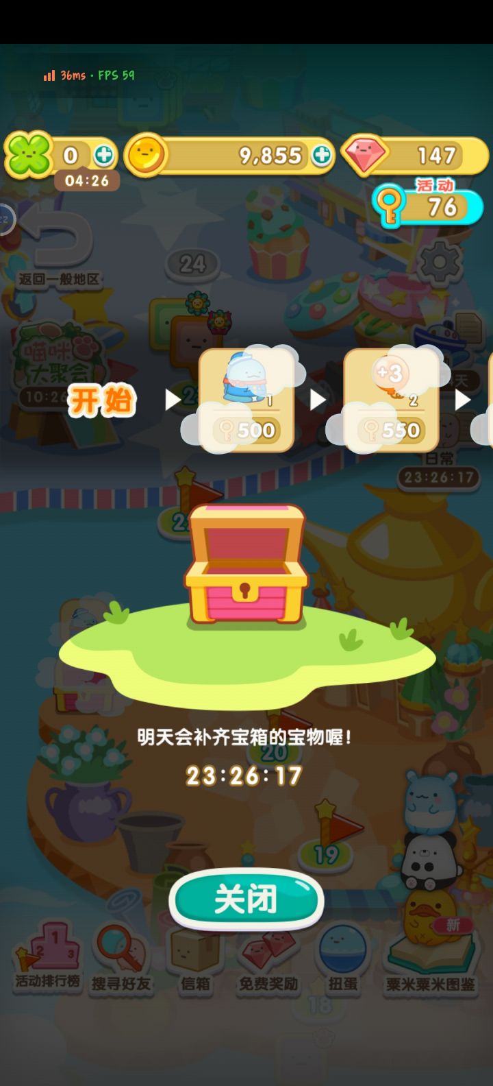 我遇到bug了。最近的新活动《世界甜点旅行》,我已经到22关了,可是20关的奖励已经三天了,我就是拿不到,每次过了23点,就是还有20多个小时更新宝箱,我等了两天了,一直都拿不到。可以看我发的图片的背景,可以发现我22关的旗子都插了,真的很无语,能不能修复一下这个bug