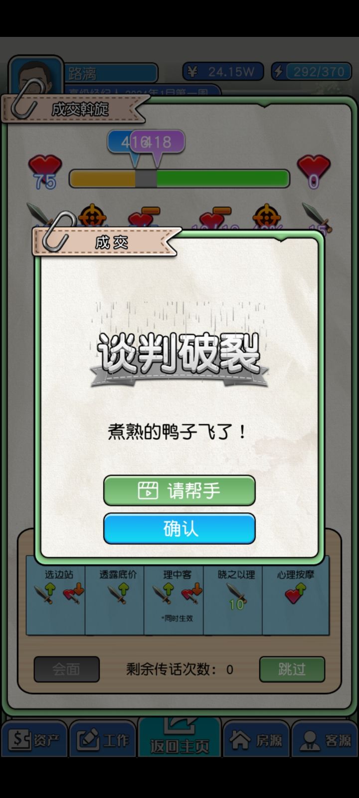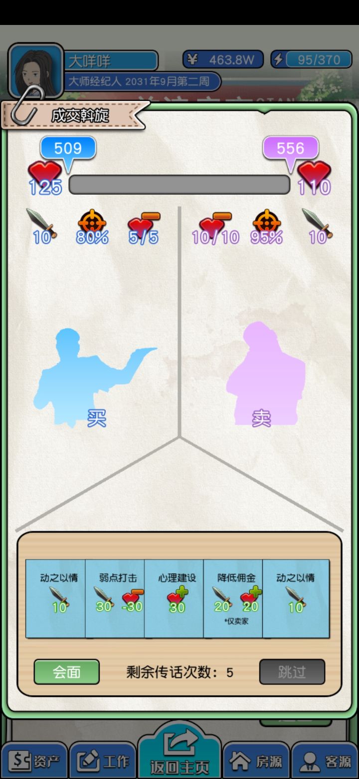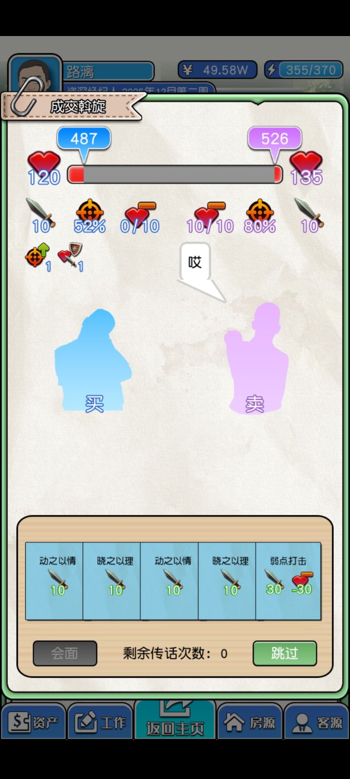 我的思路是:照着一边玩命砍,根据给的技能来看:①如果有弱点打击❤️-30和价格标定❤️-20要看双方初始❤️数据,谁的高给谁用,如果两边相同看十字靶心标志谁的低给谁用,如果也相同看小刀谁的数低给谁用(小刀一定是要给低的用,数值越高证明砍一刀的价砍的越多)这时候如果有心里建设❤️+30一定要补上,要不后面砍价❤️不够会崩溃,没有+30的话心理按摩之后再用端茶送水或嘘寒问暖❤️+10也可以(心理按摩后+10→+20),注意:如果是房主方的话虚假带看❤️+30慎用,你砍下来的价会涨回去一些。之后剩几回合可以适当补一些影响双方数值的技能或者🔪价的技能