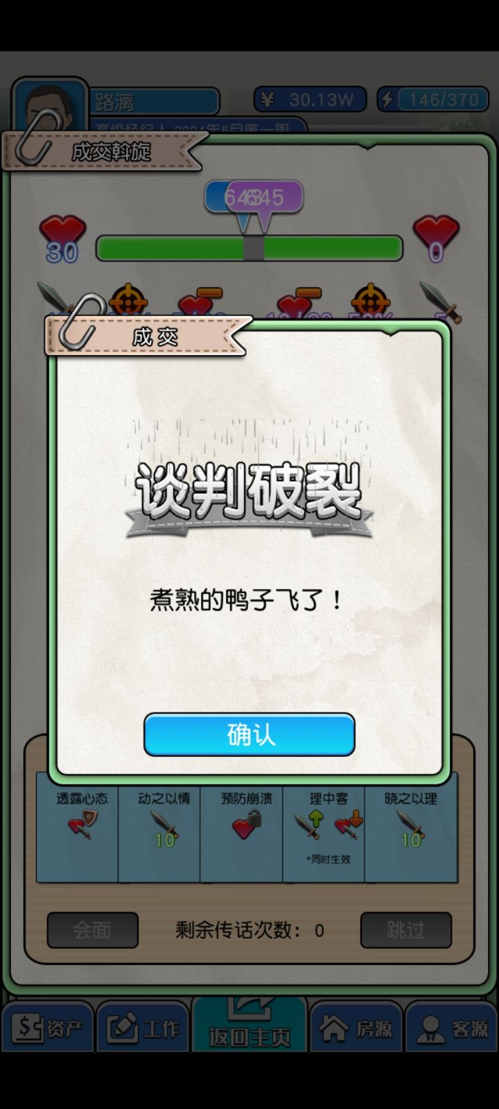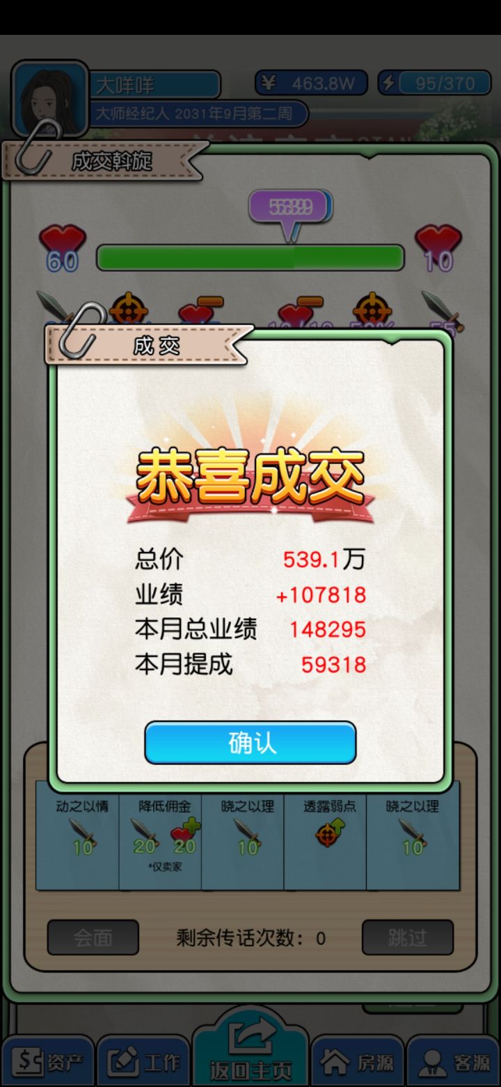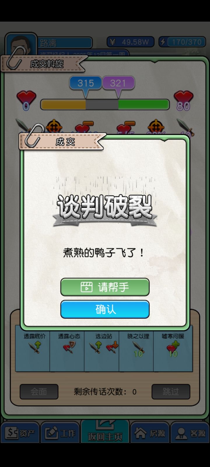 我的思路是:照着一边玩命砍,根据给的技能来看:①如果有弱点打击❤️-30和价格标定❤️-20要看双方初始❤️数据,谁的高给谁用,如果两边相同看十字靶心标志谁的低给谁用,如果也相同看小刀谁的数低给谁用(小刀一定是要给低的用,数值越高证明砍一刀的价砍的越多)这时候如果有心里建设❤️+30一定要补上,要不后面砍价❤️不够会崩溃,没有+30的话心理按摩之后再用端茶送水或嘘寒问暖❤️+10也可以(心理按摩后+10→+20),注意:如果是房主方的话虚假带看❤️+30慎用,你砍下来的价会涨回去一些。之后剩几回合可以适当补一些影响双方数值的技能或者🔪价的技能