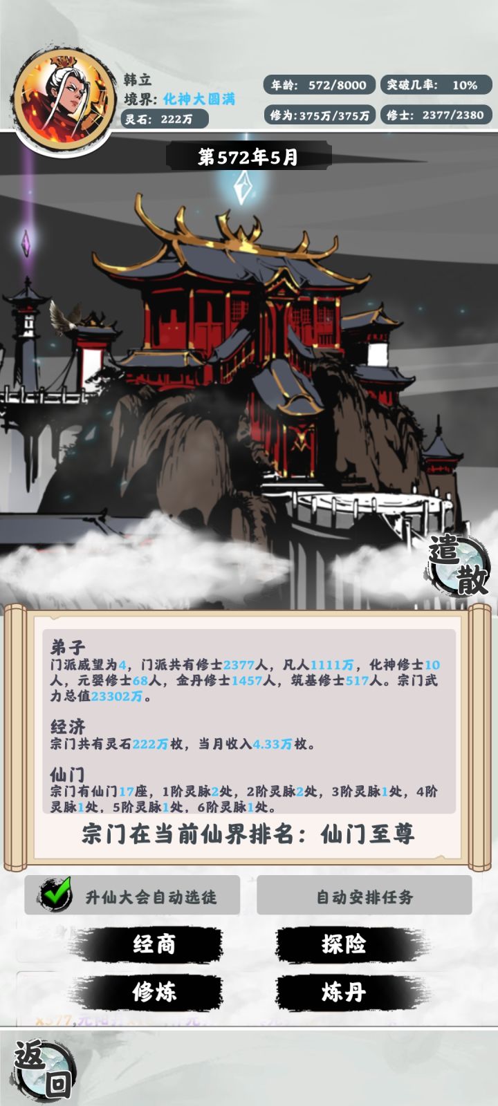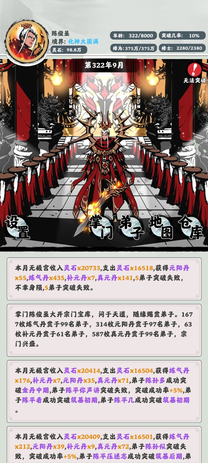 接下来的目标是在8000年内把所有弟子弄到化神,目前橙丹攒了好几万了,所有人全部炼丹嘎嘎快,快没钱了就所有人全部经商,20年后又是一千多万,嘎嘎猛,等我所有弟子化神给你们上图