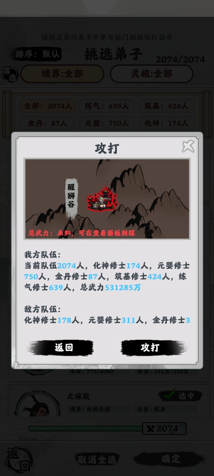 注意只要单灵根选手,消耗灵石少。 占领宗门提高修士上限,上限-实际人数=下次宗门的招人数。 小技巧:宗门招人点单灵根全选,这样很筛选修士方便。