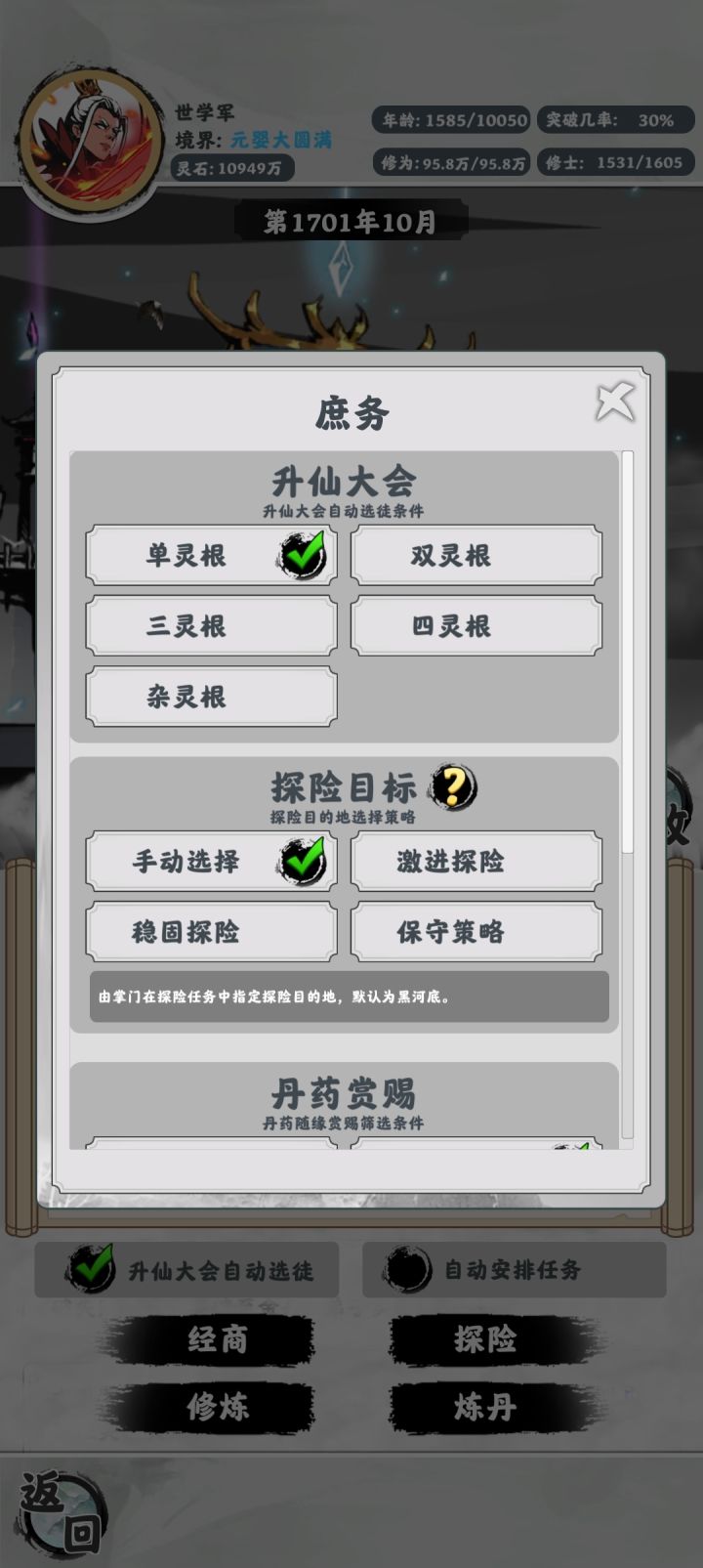 小发一个小技巧,过了前期就可以自动只收单灵根了。这时候所有的新进成员全部都去修炼,目前能到的最高境界低一境界的人都去经商和炼丹就好了,这是最高效的发展方式,可以快速增加高境界的人