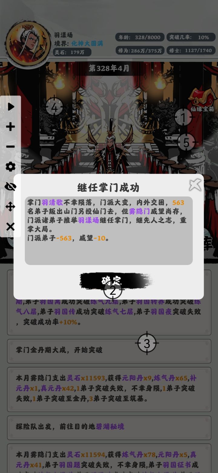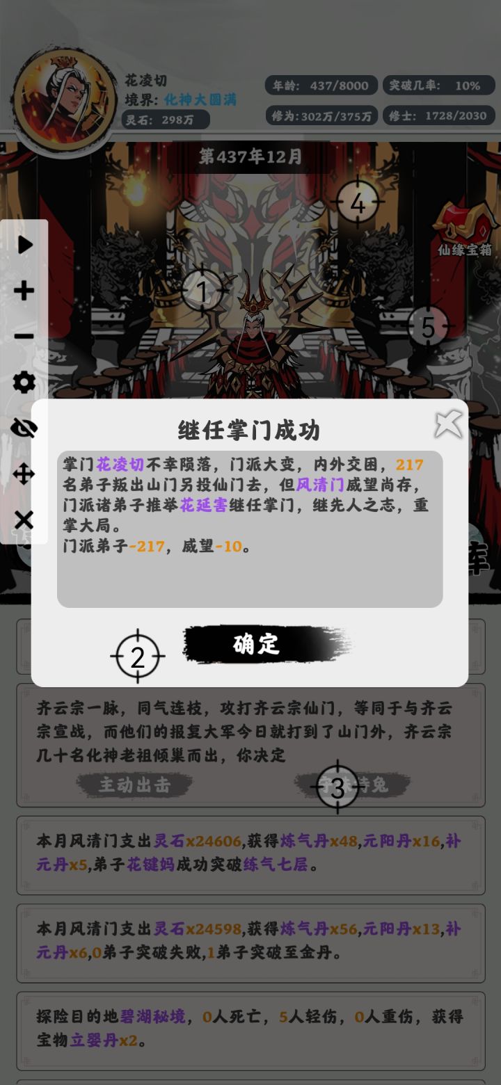给大家提供一个思路,这个版本掌门暴毙几率太大,暴毙以后人员流失太多。所以可以选择开局直接整接班人,掌门不修炼。两百年怼出一个大圆满,然后让掌门探险自杀,越往后去掌门暴毙流失人越多。大圆满以后基本上可以挂机自动收徒玩了,睡一觉基本上就可以通关了