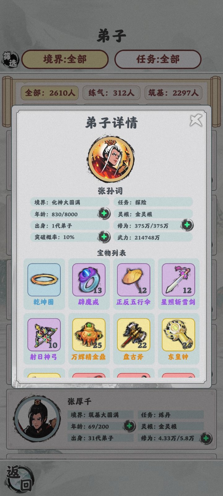 全员炼丹养出一个大佬先,后期炼丹卖丹全员修炼再炼丹再卖丹再修炼,有大佬以后就要提质量,广撒网比单独养一个得劲,我养了十几个就3个化神,有一个突破化神大圆满还死了