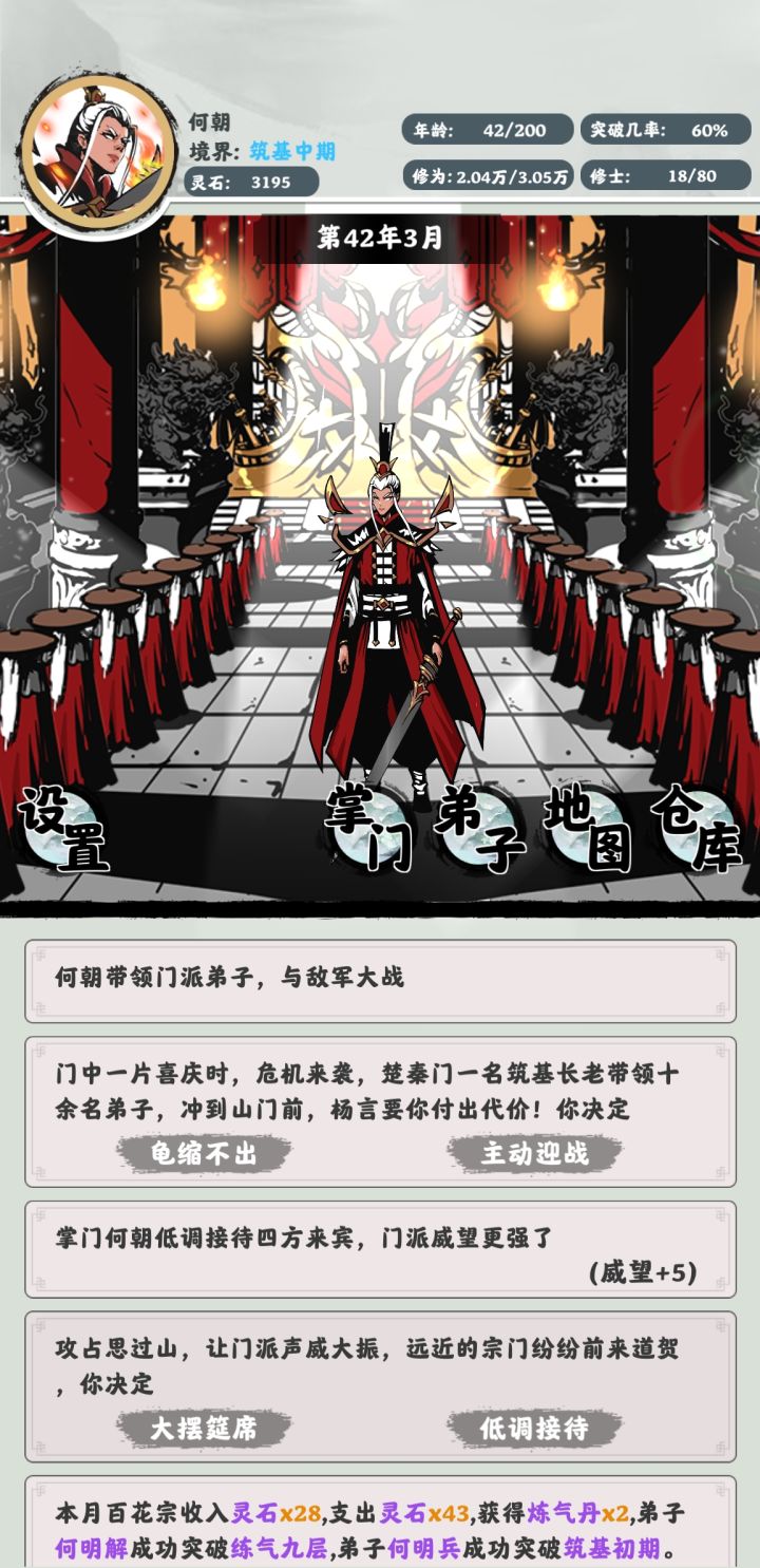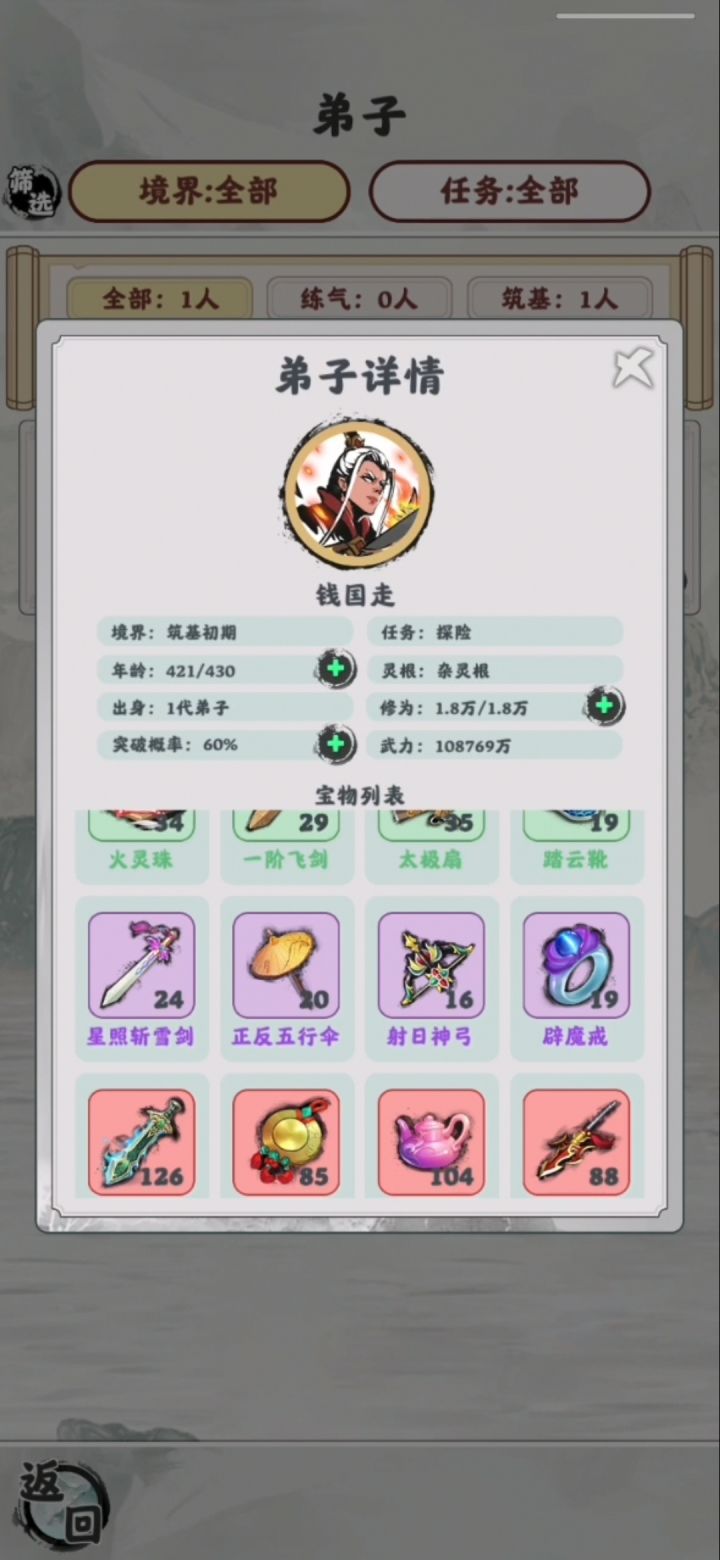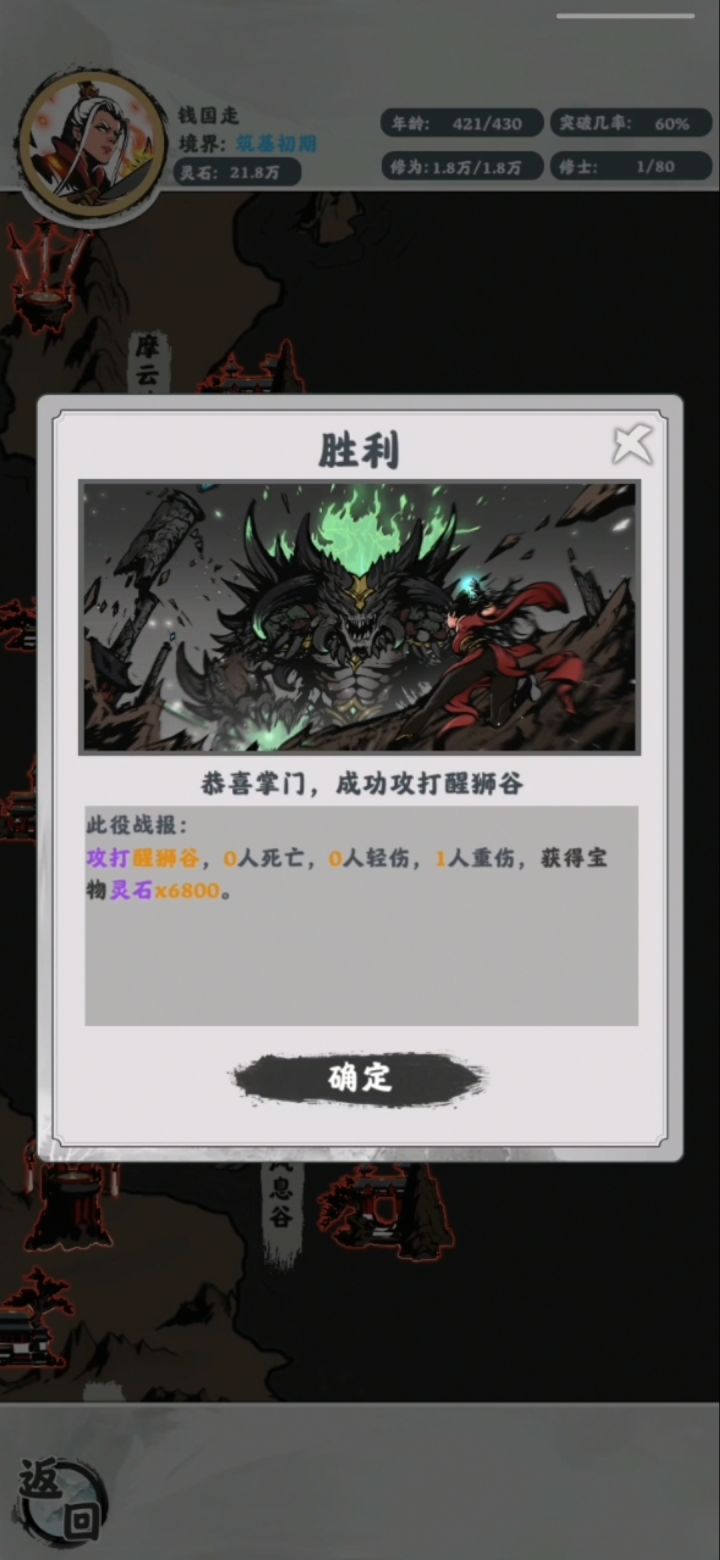 钱国涛掌门天众奇才,以杂灵根资质修炼421岁(吃了23个寿元丹)!凭借筑基初期无上修为以一人之力血洗231化神老怪的醒狮谷!😅😅 吐槽下这游戏应该叫:掌门寻宝模拟器 !