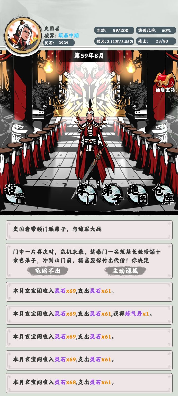 阿三阿三看过来!自动招收弟子:1.能不能出一个自动招收筛选条件呢?比如我只想招收单灵根,后期动辄十多年十多年的时间跨越总不能一直手动。自动分配任务:1.增加一个分配调整。-按照境界/灵根自动分配对应的任务-可以选择关闭哪个任务分配-探险有bug,会锁死黑河底丹药与赏赐细则1.随机赏赐时,可以增加一个分配人数(也就是变成丹药数与人数两个选项)2.原本只有“1,100,最大”,希望