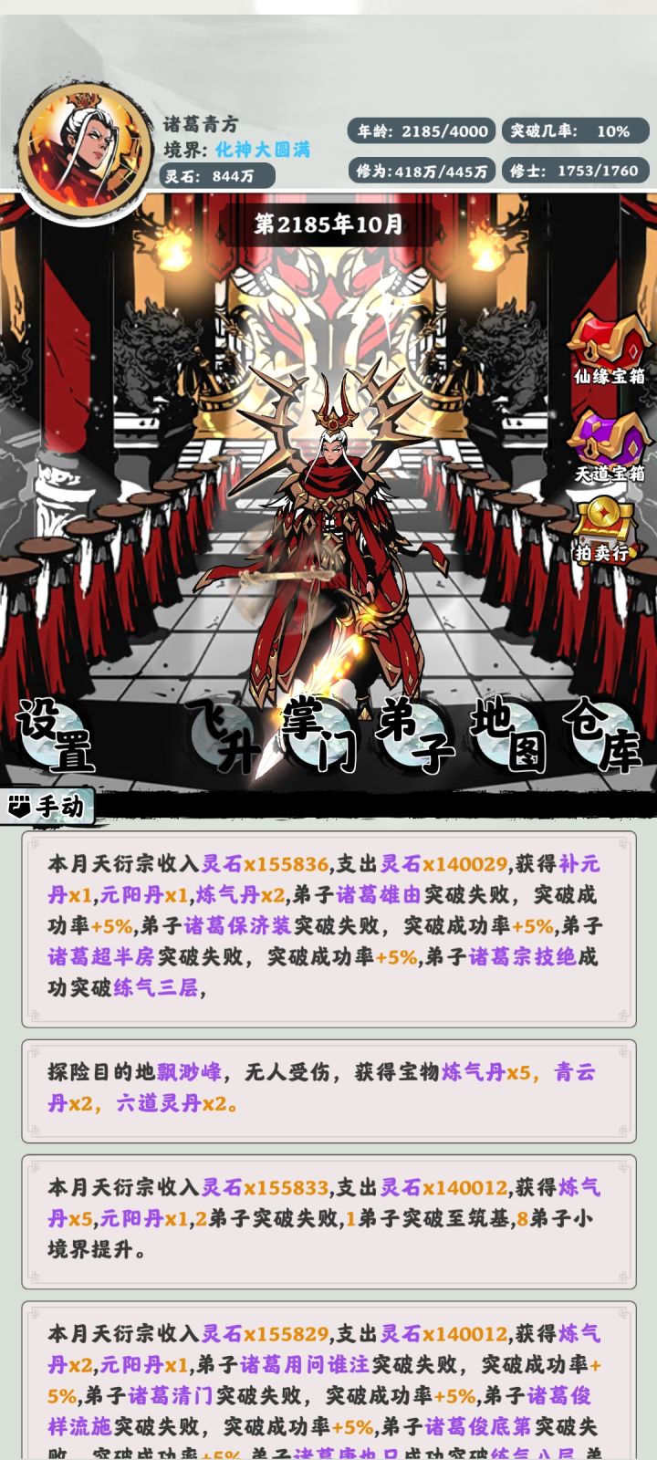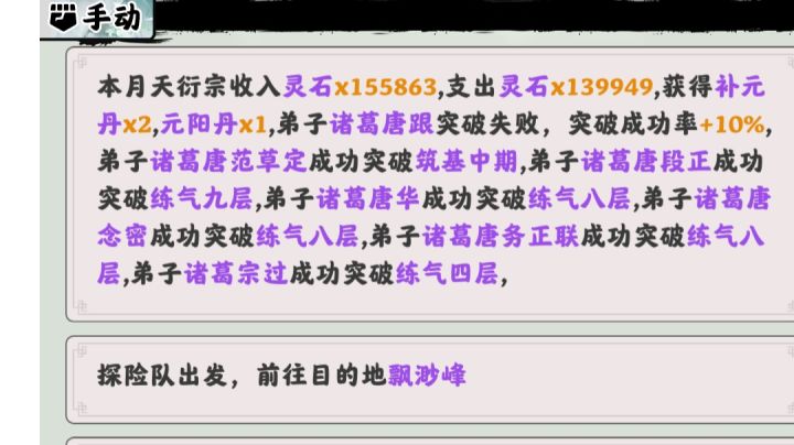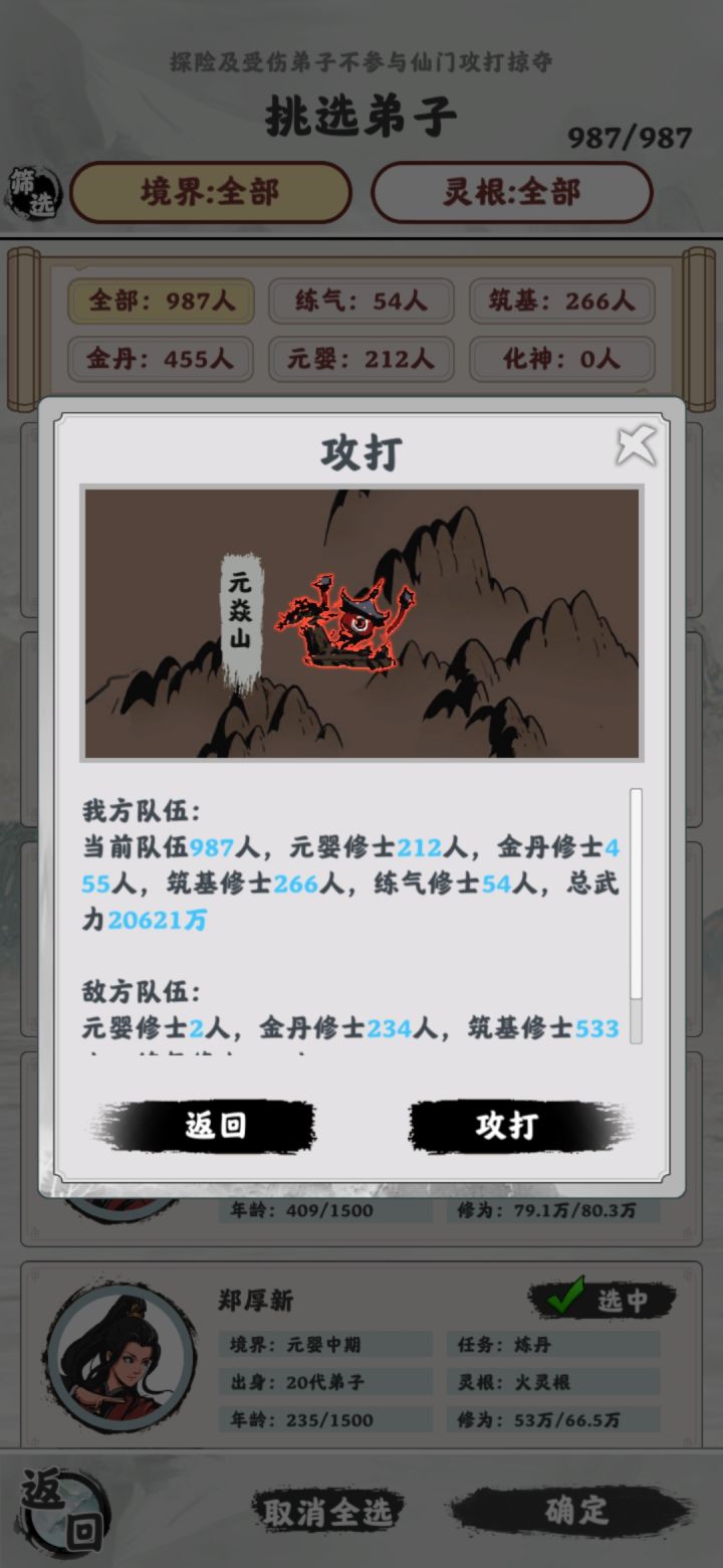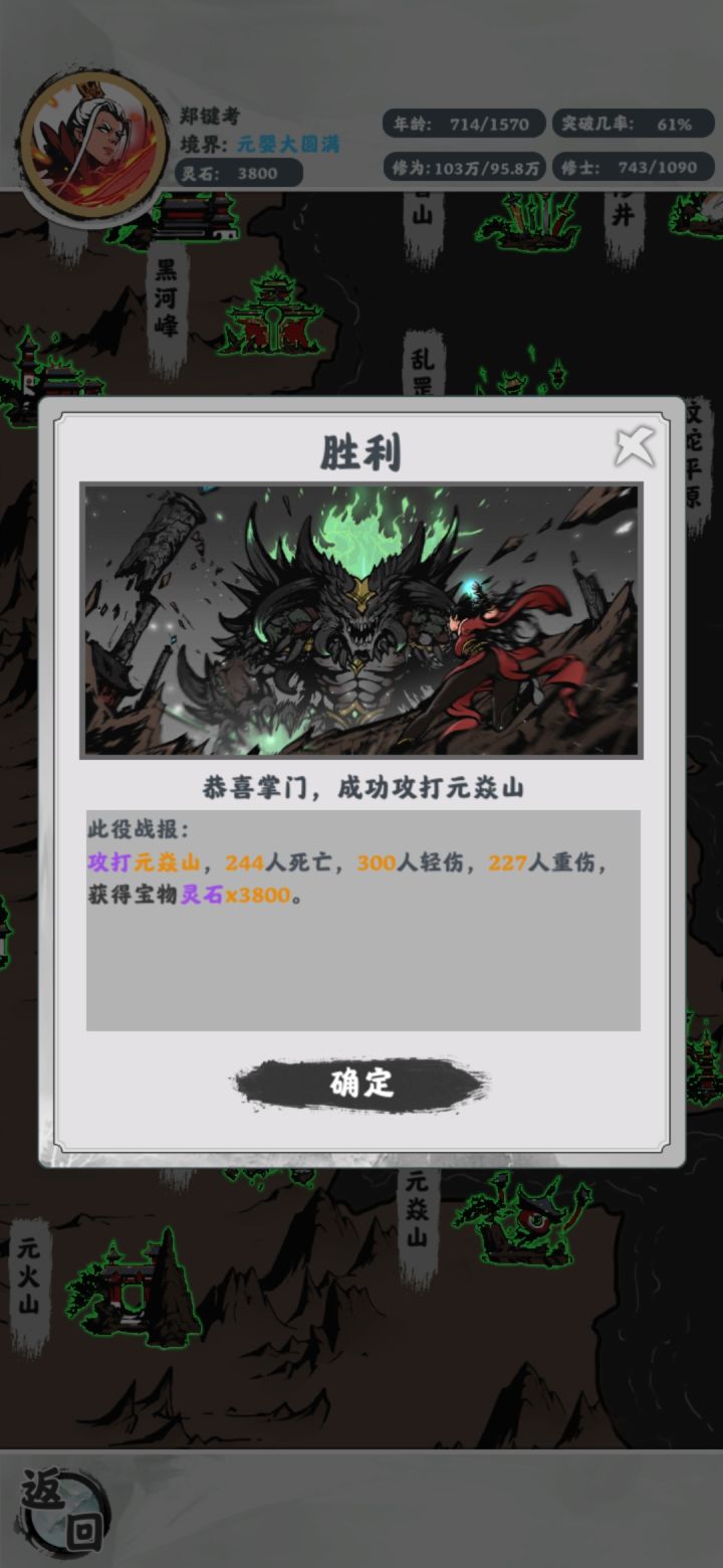 已经通关了。给一些建议和自己玩完后的感受。1.天赋条基本没什么体现。后续应该把天赋能力在游戏中多多体现。越是好的天赋就应该出现的几率约小,还有就是长按可以给出天赋条简单解释。也希望招收到的弟子也有相应天赋。2.可以加入装备系统,但个人感觉每个角色只需要装备一个法宝就可以了,没必要搞装备十个八个的。还有功法,神兽妖兽。3.灵根除去越稀有攻击力越高,好像也没啥用。这方面也是太简单粗暴了。而且单灵根天灵根太容易出了。4.在当上掌门之后就没有选择类的事件了。减少了很多乐趣。如果后续改的话,希望有更多的随机事件。5.除去主人公随着能力提升画面会改变,其他的没有啥改变,有点单调。6.地图更大一些,随机事件中npc势力会主动攻击或者会组成同盟。在地图上刷新某些随机事件来完成。7.加入中立势力,里面可以多少年一次的拍卖会。8.稍微多增加几个看广告的。当然也要给到响应奖励。最好是那种不可或缺的。玩家也会响应的看一下。要不然很难活下去。😂