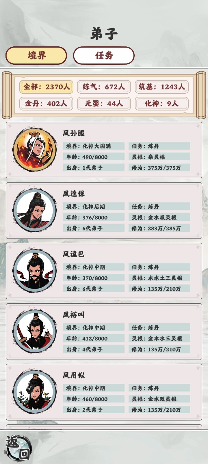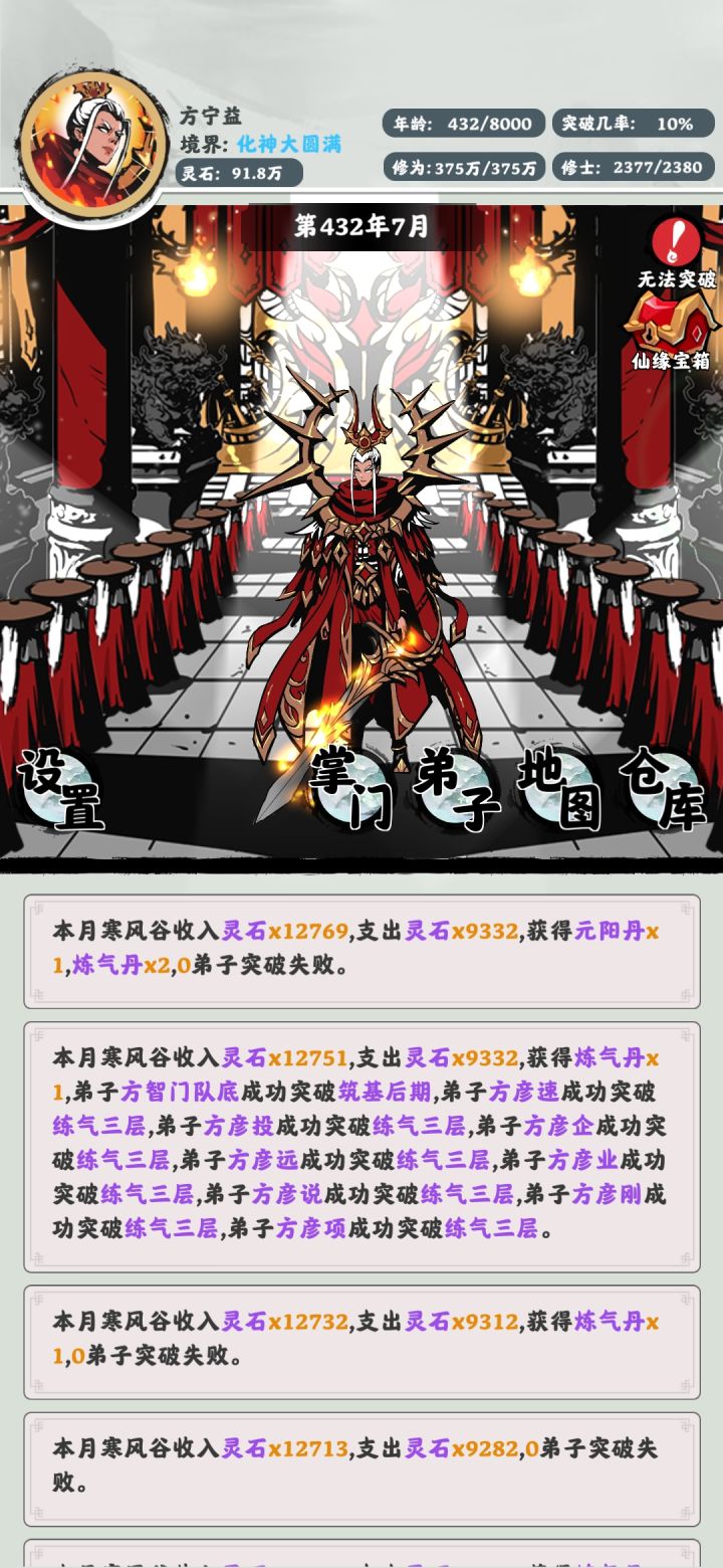 提点建议:1.你要说体力不支死于天劫吧,你好歹告诉咱们体力搁哪呢2.真心不建议“体力不支”这条死法3.丹药界面可以弄一个⬅ 1 ➡,偶尔想点两三个丹药结果一直要召唤键盘4.希望可以在弟子界面加一个赏赐,具体可以参考“修仙家族模拟器”的喂药5.希望优化一下随机赏赐,增加优先度:比如练气丹:-单灵根>双灵根>三灵根-练气>筑基>金丹-十二层~九层>八层~六层>五层~三层真元丹则是: