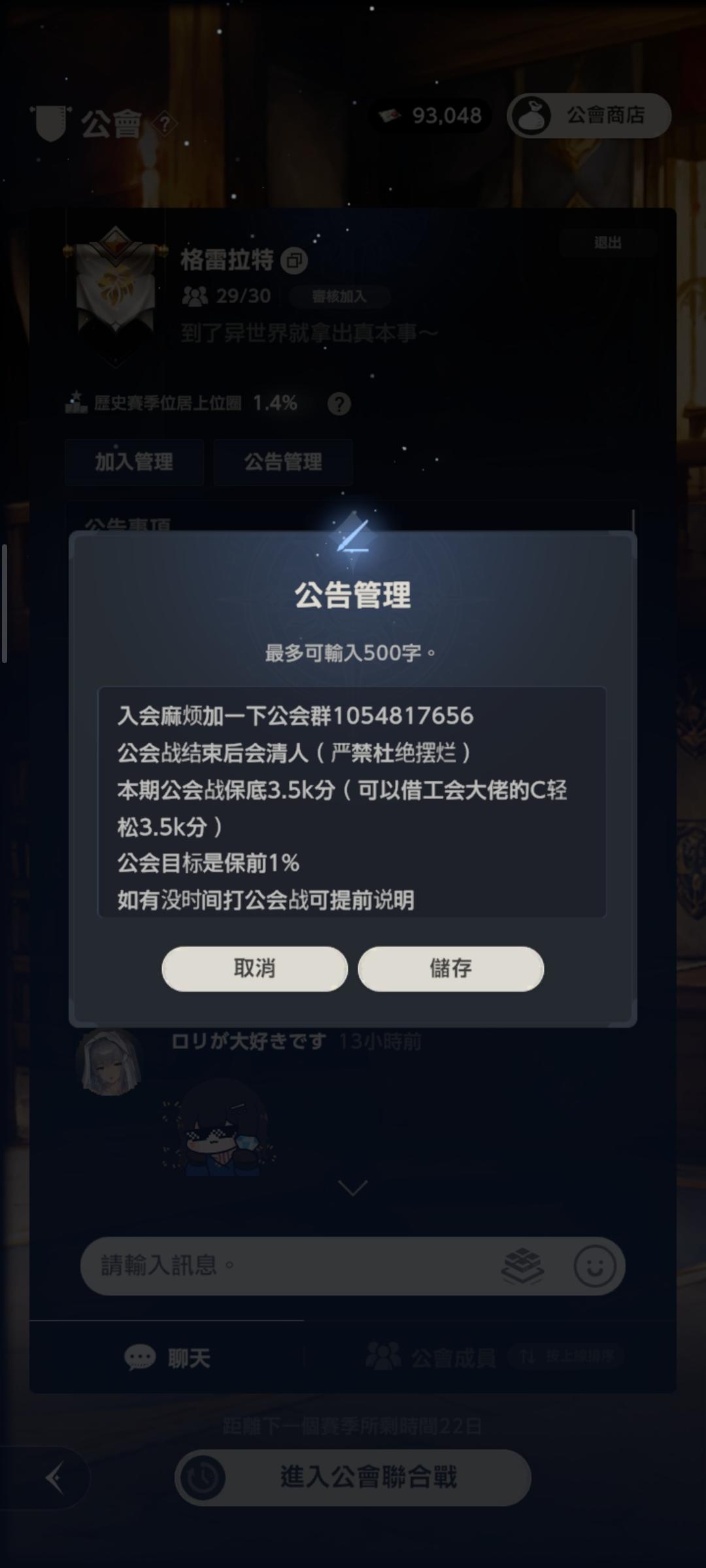 群见图2要求:1:群里大部分都是社畜,公会战期间打打公会战即可,没有保持登陆要求(不过奖励大部分都在日常/活动任务里面)2:没空打会提前吱一声,不打个招呼当成摆烂,直接优化欢迎加入喵~不加公会进来聊聊天也是可以的👌🏻❤️