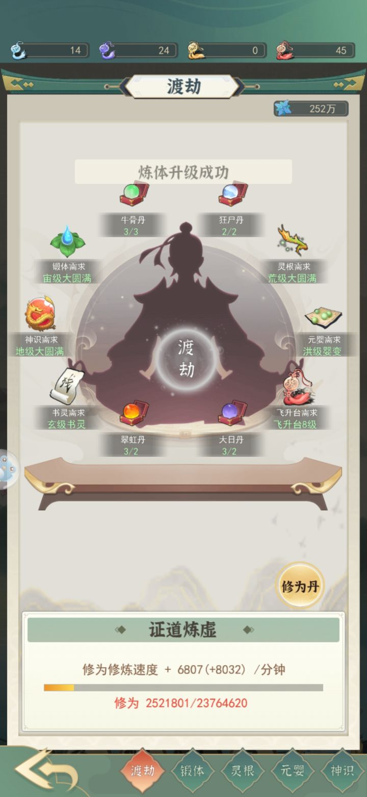 这样卡着每个境界建筑极限突破,可以使存下大量修为钥匙到了冲虚破虚阶段使用快速冲击灵界。每20级提升一次要求,80筑基圆满100级金丹圆满120元婴圆满,140化神160炼虚,而我们正常速度不存资源炼虚阶段建筑可能才勉强100。