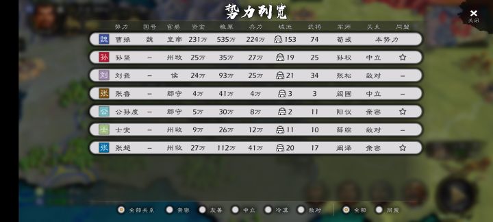 首先开局吕布手下能用的有:陈宫、张辽、高顺、吕玲绮。ps:剩下的全是菜鸡后面有安排他们的活(死)法濮阳开局,吕布带兵走水路去洛阳,再让张辽带3000兵走定陶,过梁城直奔许昌(如果许昌被袁术占了)那就往下跑占新野然后你就会和我一样,被AI袁术下了追杀令,粮草不断将不归那种从许昌追到新野。可能你会慌,但我告诉你不要慌,接着往下开船去巴丘港占长沙这个时候袁术虽然不追了,但刘表这瘪三开始了追杀