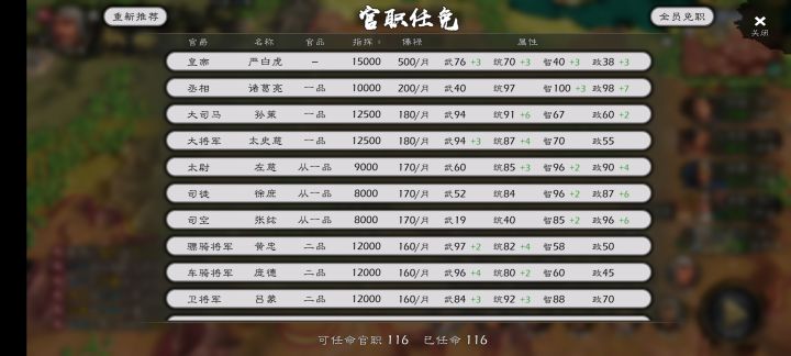 任命太守:任命守城武将,收益增加,统加兵力,智加钱,政加粮攻占城市治安问题:攻占城市治安由100变成95,若占领城市兵力为3300,治安会维持95不变直到兵力达到9200,治安会慢慢恢复为100,占领城市兵力为5000,则会立马提升慢慢恢复为100占领后兵力不足3300,治安会从95一直往下降,兵力3千3治安会停止下降维持在八十一或八三,兵力八千,治安会从81或83升到89,8千4(特例一次),9千2提升到100生病武将痊愈:用药立马痊愈或生病的武将不管150天自愈