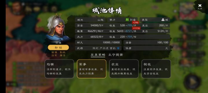 有些小建议:1.府城和港口太多,但是又没什么用,不能自己增兵和加资源,可以稍微增强一些,入驻武将可以发展城池 2.小城可以搞特色产品,比如什么铁矿,马匹,这些可以打造兵种,不同的兵种需要不同的资源,也有地方特色。 3.到后面文官的武将越来越没用,也越来越多,可以弄一个地方有什么职位之类的。比如太守和州牧,大城池有各种发展的数值。 4.最好可以有城池的人口,造兵至少要贵一点。要发挥好粮食的作用,没有