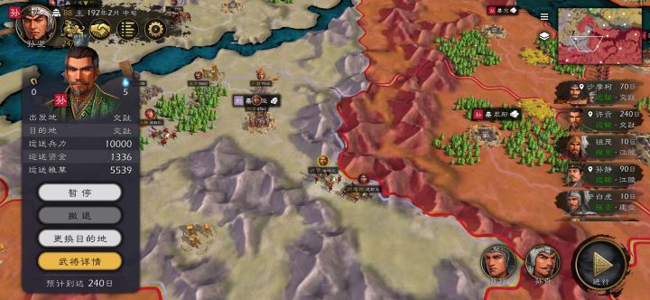 这运输逻辑问题蛮大的,之前从右下到这了,想让他转到就在右上一点点地方的武陵,他显示要400天。最后选择全部撤退,同样的撤退回同一座城,一个是原路返回就70天的一个是要绕一大圈240天的的。这AI逻辑明显有点问题啊。😓