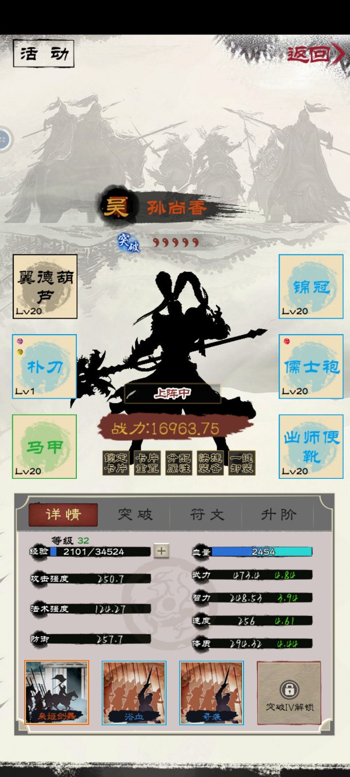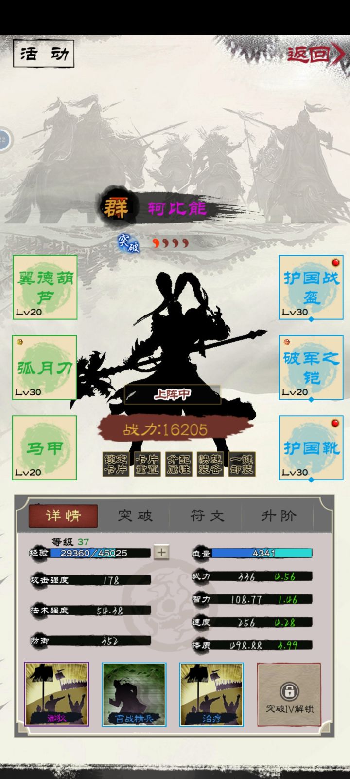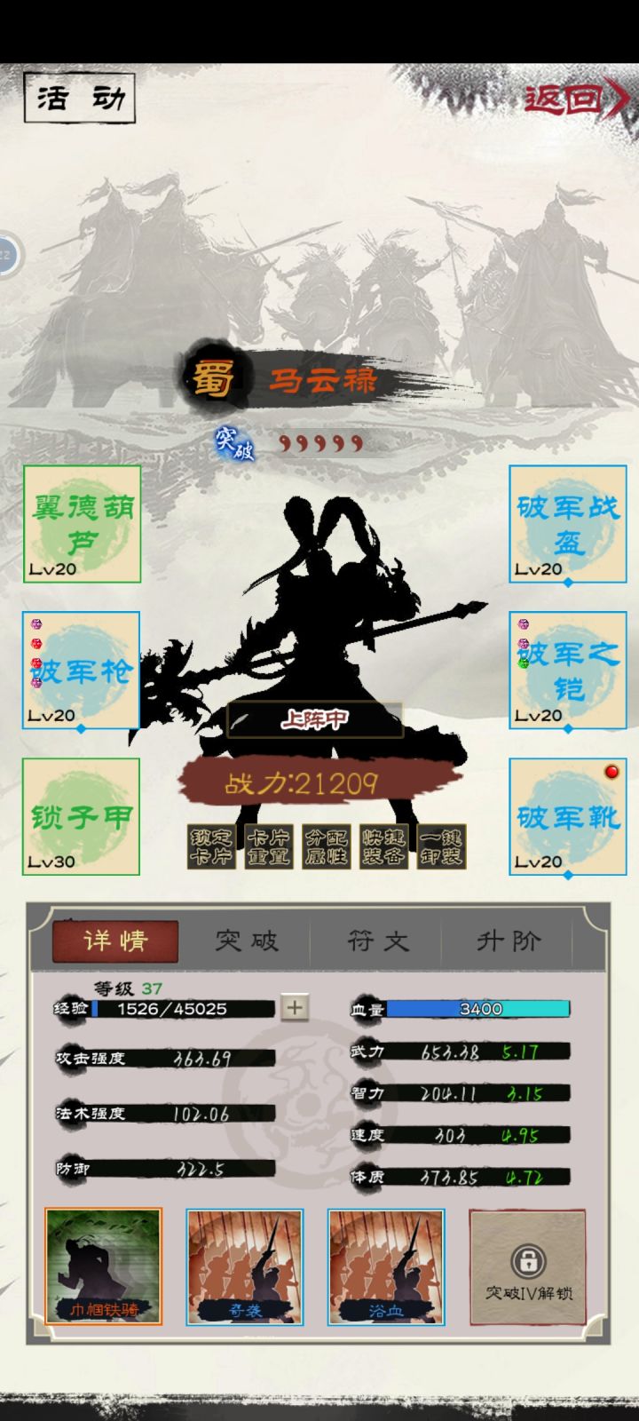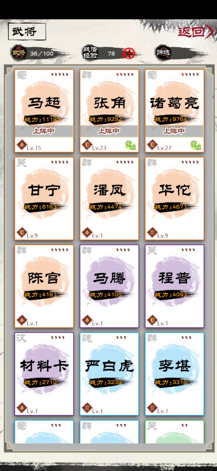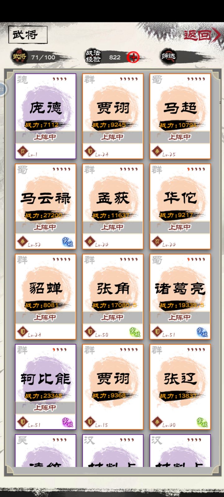 马云禄的输出目前配了暴击,一次伤害5400+,加上张角清场,诸葛亮控制和900+稳定回血(洗练几次出了治疗+100,包扎是恢复三次,均有加成)。完全阔以玩。我不想再废元宝抽了,目前已经非常舒服啦。