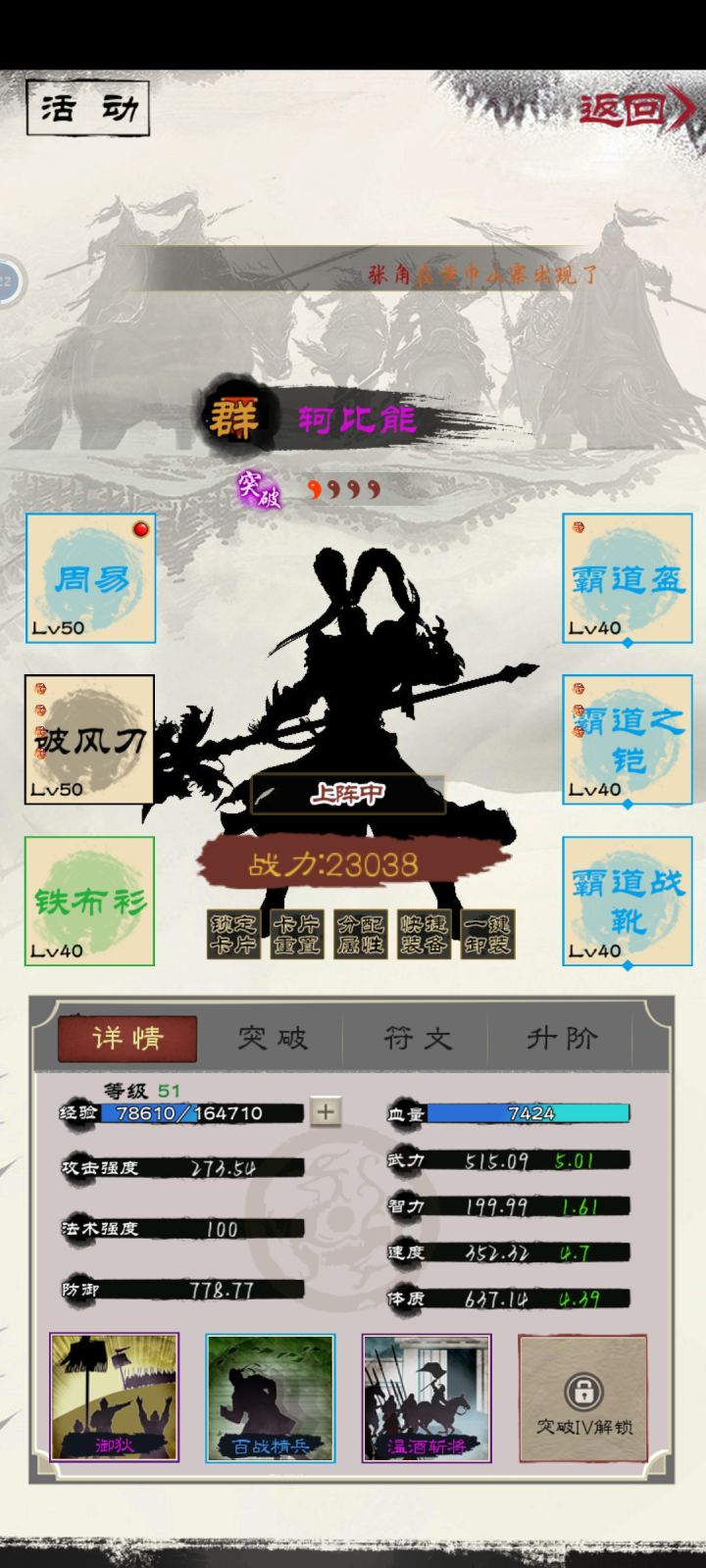 目前吧,八百防御,比我输出主力张角攻击还高。加盾一次650+,加盾期间40%+减伤。这个盾,60级BOSS张勋一两次攻击还破不了盾,所以你知道多强了吧。刷盾频率也高,挺一分钟都是正常的。