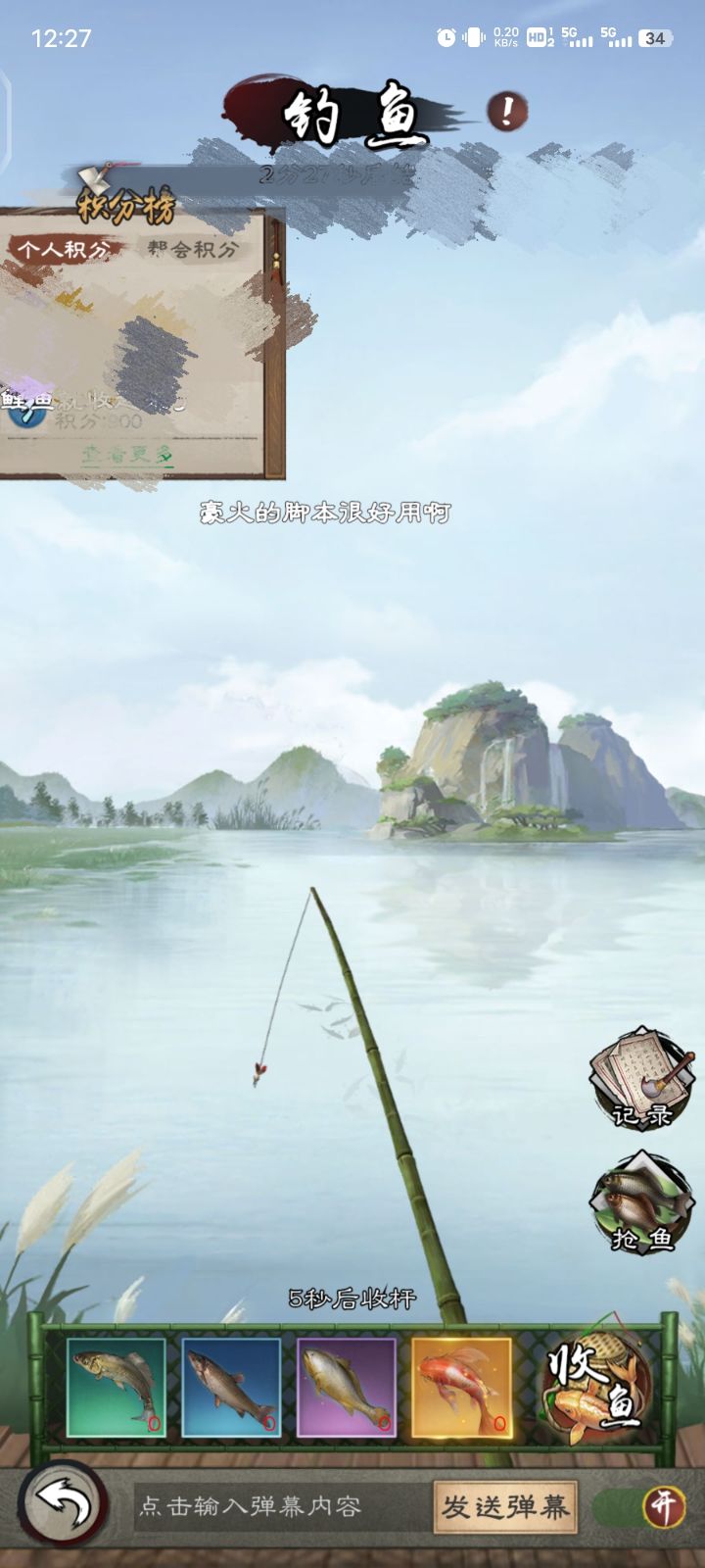 一天中午钓鱼的活动非常好。活动时间又长,大家都很好的发弹幕互动。虽然钓的锦鲤你还没到手,就被脚本抢了。但是想到有真心喜欢这个游戏,玩还充钱的大冤种真的很开心。