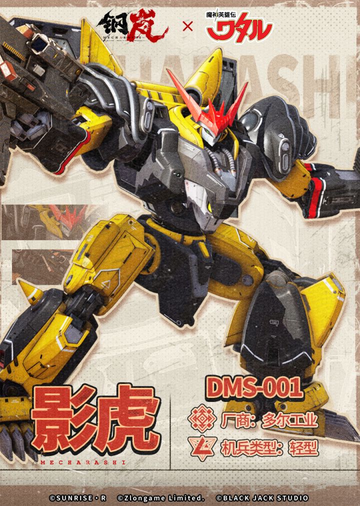 DMS-001 影虎由西塞罗博士设计,多尔工业制造的轻型机兵。该机拥有高纯度岚质框架与新式复合装甲,兼具优秀的攻防性能。此外,精细调整过的传感辅助系统也使得它在中近距离作战中拥有无与伦比的突破能力。 ▶ 机兵模组◀ •影袭链路 LV.MAX:攻击时,根据连击数提升暴击率和无视护甲值,有最多提升上限; • 异态模组LV2:自身每携带1个增益效果或减益效果,伤害提升,有最高提升上限; L