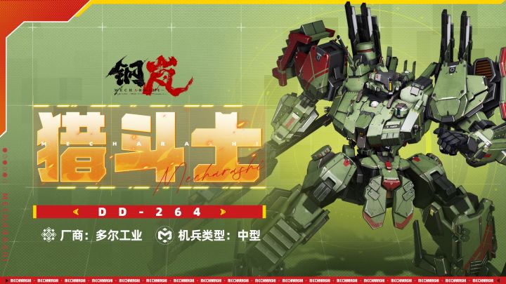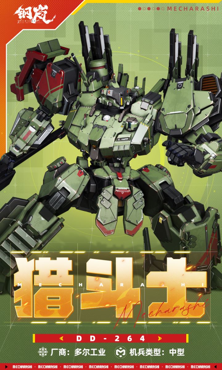 DD-264 猎斗士由多尔工业与角雕商会联合研发的中型机兵,是专为佣兵设计的新式模块化作战平台。DD-264猎斗士将设计的重心牢牢锁定在「实战」这一点上,它采用了经过多次迭代的XF3S规格钢岚合金框架,搭配具有双冗余设计的T型超高压涡轮动力系统,拥有在绝大多数环境下均可稳定运转的扎实基础。全身的模块化装甲接口和通用武器挂点确保了它具有巨大的替换改装空间,使用者既可在战前根据自身风格精细调整武装