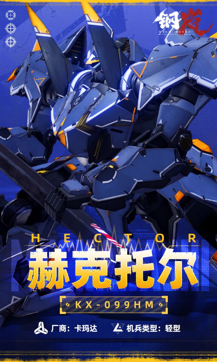 由卡玛达公司制造的第三世代轻型机兵,因其出色的机动作战能力,受到了多国特战部队的青睐。作为公司首款自主研发的高端轻型机兵,KX-099HM赫克托尔有效填补了卡玛达产品线中高机动强打击机型的空白。改良自KX-098奥德修斯的新型钢岚合金框架以及传感监测模块,搭配小型化的高功率动力系统,使得赫克托尔在防护与机动方面的综合表现明显超过了第三世代轻型机兵的标准水平。▶ 机兵模组∆ 忤逆者单元 LV.