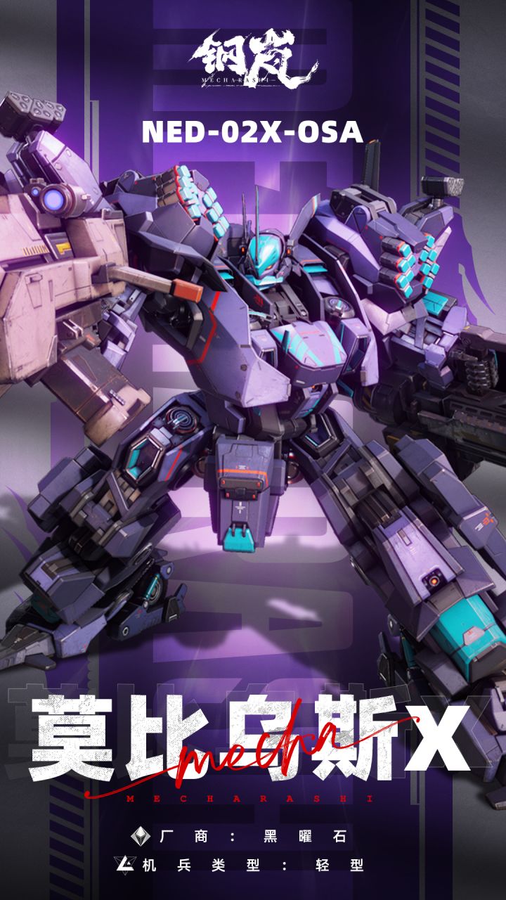 NED-02X-OSA,由黑曜石对NED-02莫比乌斯进行全面改造而成,是一部能最大限度发挥原型超适体能力的战斗特化轻型机兵。该机的框架与核心防护由黑曜石秘密研发的XF5A钢岚合金完全重塑,单座超高增压发动机也被替换为两组岚物质自循环引擎,以惊人的推重比确保了极为优秀的全环境机动性。此外,凭借头部天线阵列、机身各处精密传感单元以及次世代武装模块的协同运转,该机可以无障碍地进行攻防姿态瞬时切换,实