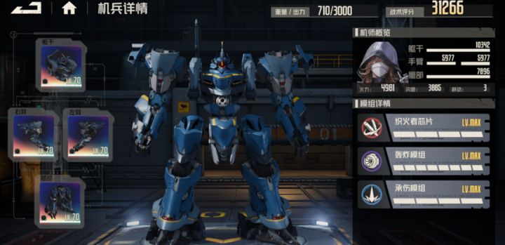 破刃之劍原创,转载或引用本文请注明来源及原作者机兵指南——裁决者全面分析机兵配置分析: 首先看看甲的数值和模组,裁决者拥有2290净出力,2290是目前所有机兵中最高的净出力,可以负担起经过减重的双重火箭加上弹药背包的重量,火力值4981,高于马尔萨斯,在中型机兵中是仅次于银闪的存在。 最近的两架机兵的四级模组,都有一个规律,那就是渐渐地突破了30%的增伤上限,提到35%,但并不是常态