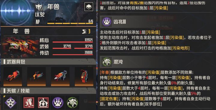 破刃之劍原创,转载或引用本文请注明来源及原作者【轰鸣万象二——高难挑战三除夕】分析及攻略 一、 关卡分析:本关可以算是三个高难挑战中最简单的一关了,这主要是由于本关敌人对我们的污染值叠加比较有限,同时又提供了高效的清除污染值手段。下面结合实际具体来分析下,首先是年兽的凶兆技能,释放范围攻击时,根据技能范围内的目标数量叠加对应层数污染值,范围攻击就是火箭以及枯荣,但是由于年兽的武装和传动部位