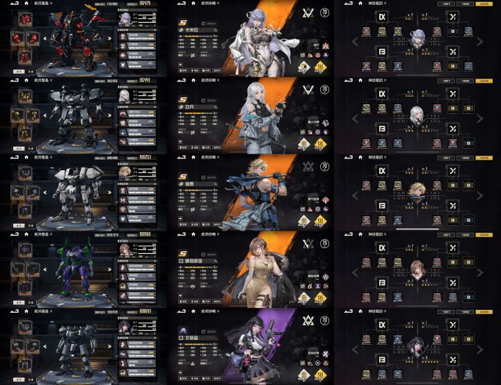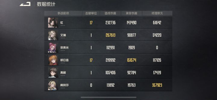 出场阵容(战力738908):淀真嗣(5命/7+16/金3一号机+彩右臂/隐形增伤背包/彩重狙)、明日香(3命/7+16/金3二号机/再攻击移动背包)、虹(4命/16+7/彩格莱杨/移动增伤背包)、艾琳(1命/1+16/彩马尔萨斯/银闪模组/技能携带石墨弹头)、梅丽莎(3命/1+16/金2金3开拓者)、奈奥米(1命/7+1/金3金2日弩/两把彩导弹)。四回合前赶路,尽量把小兵除掉,四个小boss