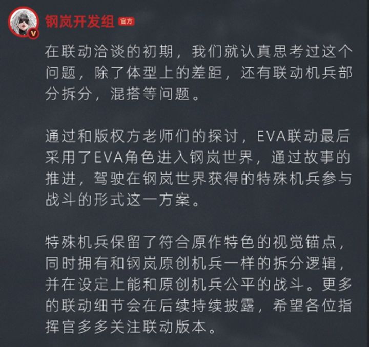 破刃之劍原创,转载或引用本文请注明来源及原作者本文仅为个人观点浅谈eva联动之机兵篇书接上回,上篇文章聊完了eva联动机师,这回笔者再来谈谈eva联动机兵相关话题:一、 机兵形象问题联动机兵的设计并不是完全与原作相同,这一点实际上是由多种因素决定的。之所以不采用与原作一致的设定,官方对此的正式回应是这样的。 由于钢岚与eva两者世界观具有较大的差异性,eva机兵高度80多米,本质上是