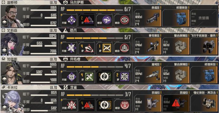 格斗:满命满瓶虹,彩格莱阳。三命或一命白月一瓶或三瓶,赫拉姆金三或彩。凯70开全技能。战术:一命三瓶艾琳,金三破阵模组马尔萨斯伪彩。下位西塞罗,露西亚70级技能全开。维修:除克洛伊其他都可,主三命三瓶梅丽莎,副再动奶,金三开拓者。一命突击全队主芙满瓶暮色彩,罗莎三瓶xr彩加专武,威廉三瓶金刚彩或金三加模组伪彩,马库斯三瓶。突击队下位艾米莉,哈维,里贝卡,玛丽70级并技能全开。守护者:安娜70级开技