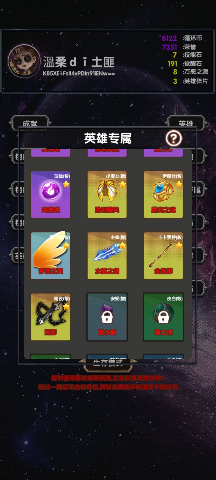 我刷的7红装 属性都洗好了还有3个9级宝石敏34 智29 力13 两天没打 我宝石没了 回个档成了我第一天刷的东西了 不是开一局无尽自动存档嘛