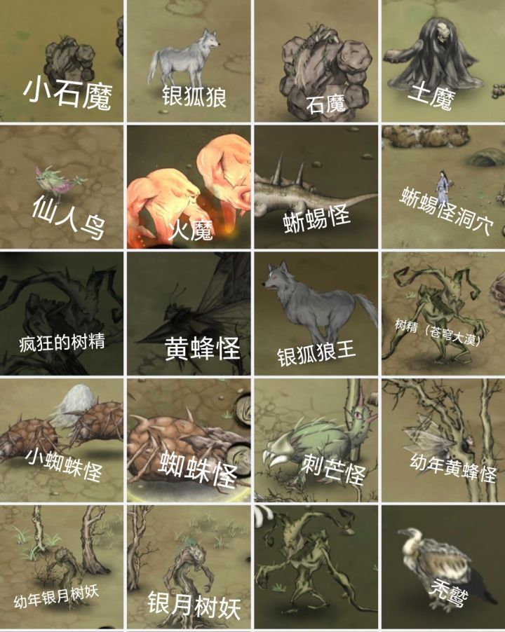 石魔:家门口的“boss”,数值对于初来沙镇的角色极其不友好。主要分布于沙塔城郊和金色岭北部,会举起拳头冲向玩家,概率掉落大石块。小石魔:身体暗黑,但血量伤害并不逊色。尝尝报团在石魔附近,会举起的拳头冲向玩家,概率掉落坚硬的石头。银月树妖:佝偻身形的枯木作妖。集中于枯木林地区,会挥动爪子冲向玩家,也能够蓄力发射木刺远程攻击,概率掉落银月木或灵晶之泪。幼年银月树妖:伴随银月树妖的幼年体,集中于