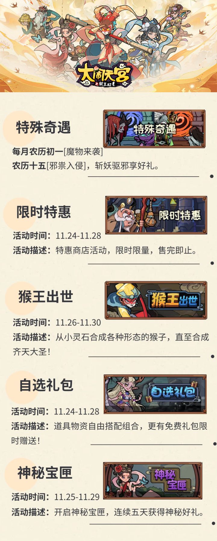 亲爱的大圣:农历十月,迎来了中国三大“鬼节”之一的“阴冥节”。趁鬼门大开,不少邪祟潜入人界,祸乱人间,大圣火眼金睛,鬼怪无所遁形,准备好棒打邪祟了么!10月27日14点游戏将开启2小时停服更新维护(开服时间以实际为准)。维护结束后,将为大圣奉上一份丰厚的更新奖励,请前往邮箱查收。【新活动】1.奇遇·邪祟入侵:10.28-10.31奇遇·限定事件-邪祟入侵,消灭鬼怪可获得丰厚奖励!2.月卡