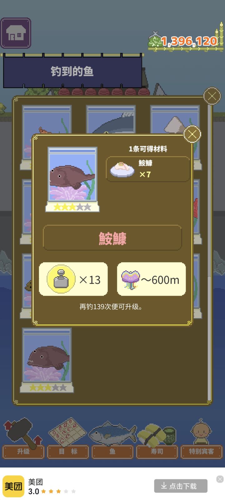 游戏可玩性很高,从原材料钓鱼开始,到做寿司挣钱,中间还有剧情,都是蛮有意思的不过广告bug有点多!钓鱼丰收的,看完广告也没有,而且好多次看广告翻倍钱也没有翻倍,有些广告还会一直跳转,关都关不掉,还挺恶心的