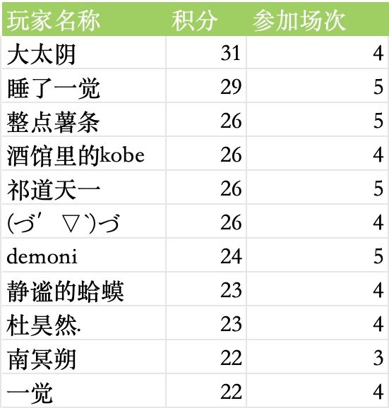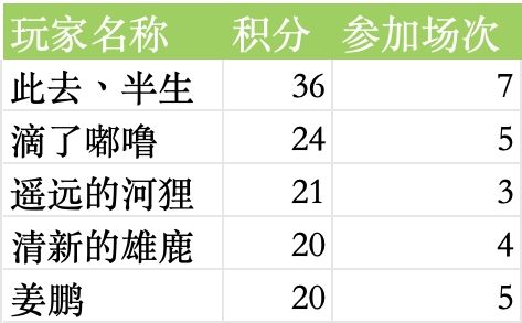 现在加入QQ群,与群友一起开黑,还能同时获得奖励!玩家群②:723614197 各位玩家好,非常感谢大家的参与和支持。恭喜以下玩家获得额外奖励,他们的积分分别为:【鱼肉】 32分、【我爱媚媚】 30分、【祁道天一】 26分、【就当黑胡子】 23分、【学儿食媳汁】 22分、【chris3】 21分、【白与黑】 21分、【9873】 20分,其他参与的玩家获得参与奖励。比赛规则:1. 每日傍晚