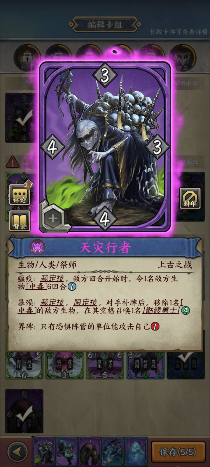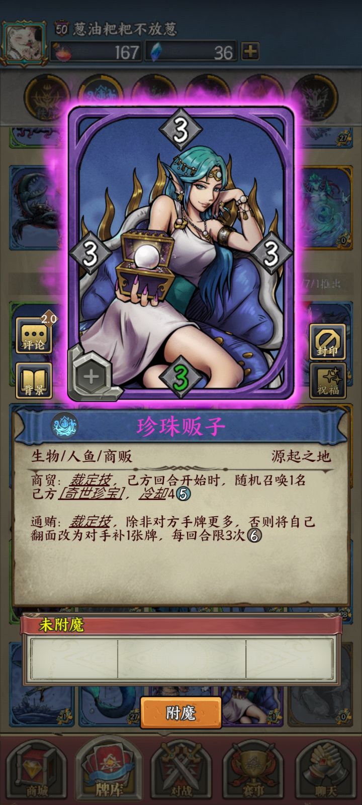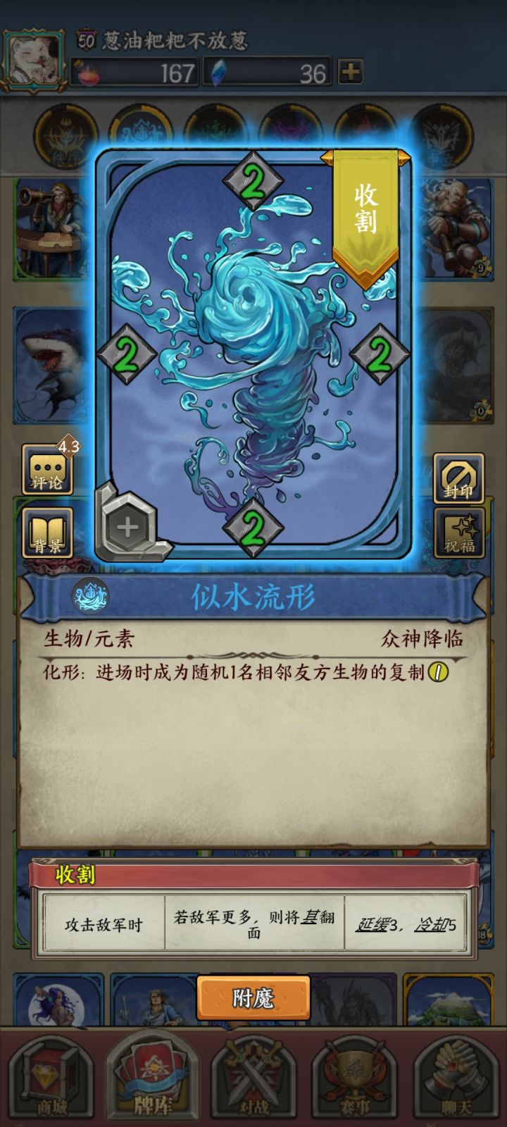 套路核心牌,互通直接翻对面牌子,附魔永封增加容错率。核心二死神,强抗性搭配互通技能白嫖对面附魔贿增也是利用抗性,但是实战不佳,往往是我多敌少,还在努力附魔永封沉默愚惑一类技能强容错。自带技能可以把翻过来的卡牌保住,再次被翻后变成损坏骷髅兵,至少保一个空地。补牌卡,附魔也是为了占场周期沉默,效果拔群。神器加快体系进度,挺过第一回合直接成型。附魔挺难的,保命要紧。怕鲸鱼类似直接打咩。这个才是