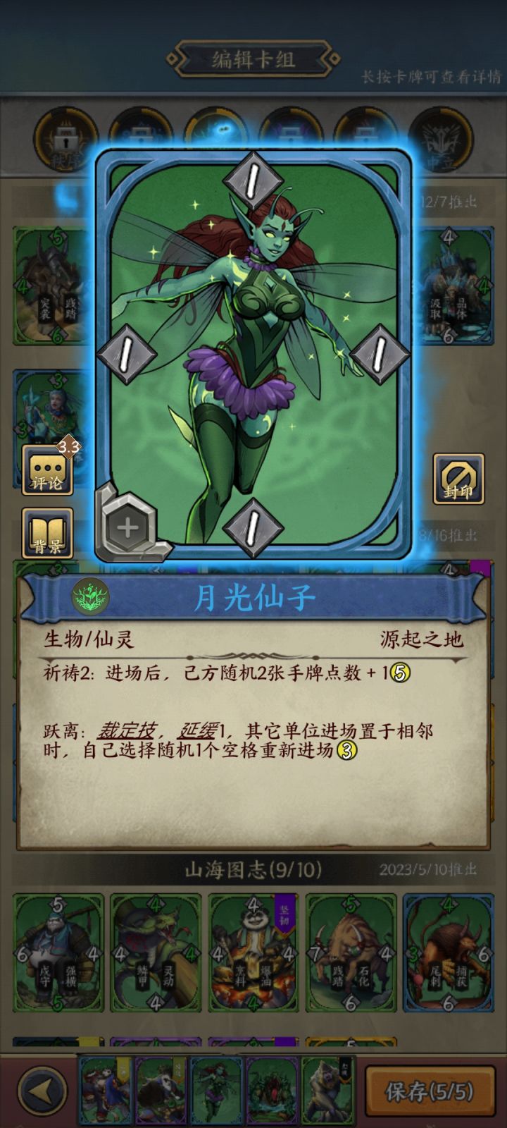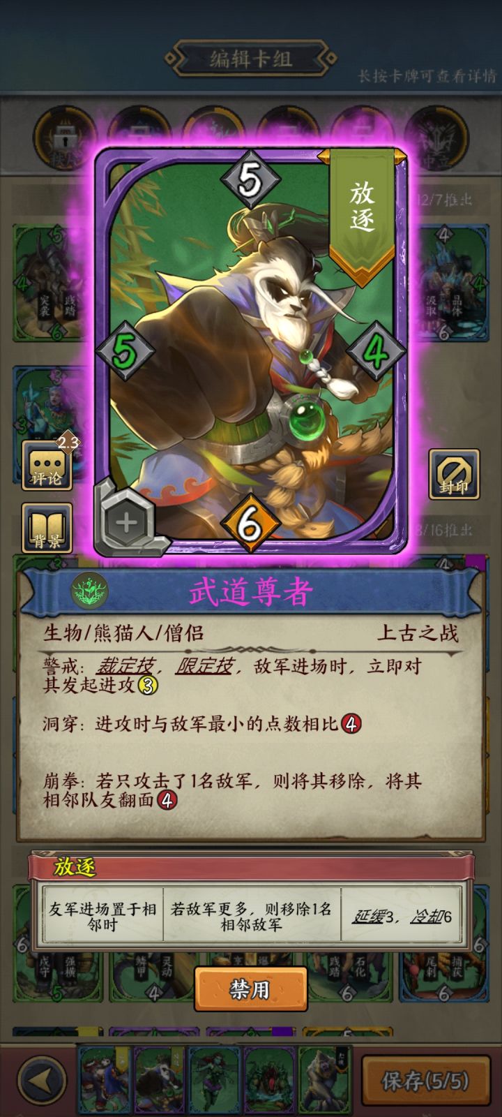 前期靠“月光仙子”和“长臂山魈”加点,建议的时候注意尽可能利用这前两张牌最大化给剩余的3张手牌加点;打击力量的核心是“武道尊者”,加完点的“武道尊者”周围基本上对方的卡落不下来,来一张就被“崩拳”移除,而且,只打一个目标时,被“崩拳”打到的卡周围的对方卡也会被翻面,靠这个隔山打牛的技能,能间接翻一些不好打,(比如飞行卡、高点数卡、无法挨着直接打击的卡);“武道尊者”前期抽不到,用钻石换一张都是