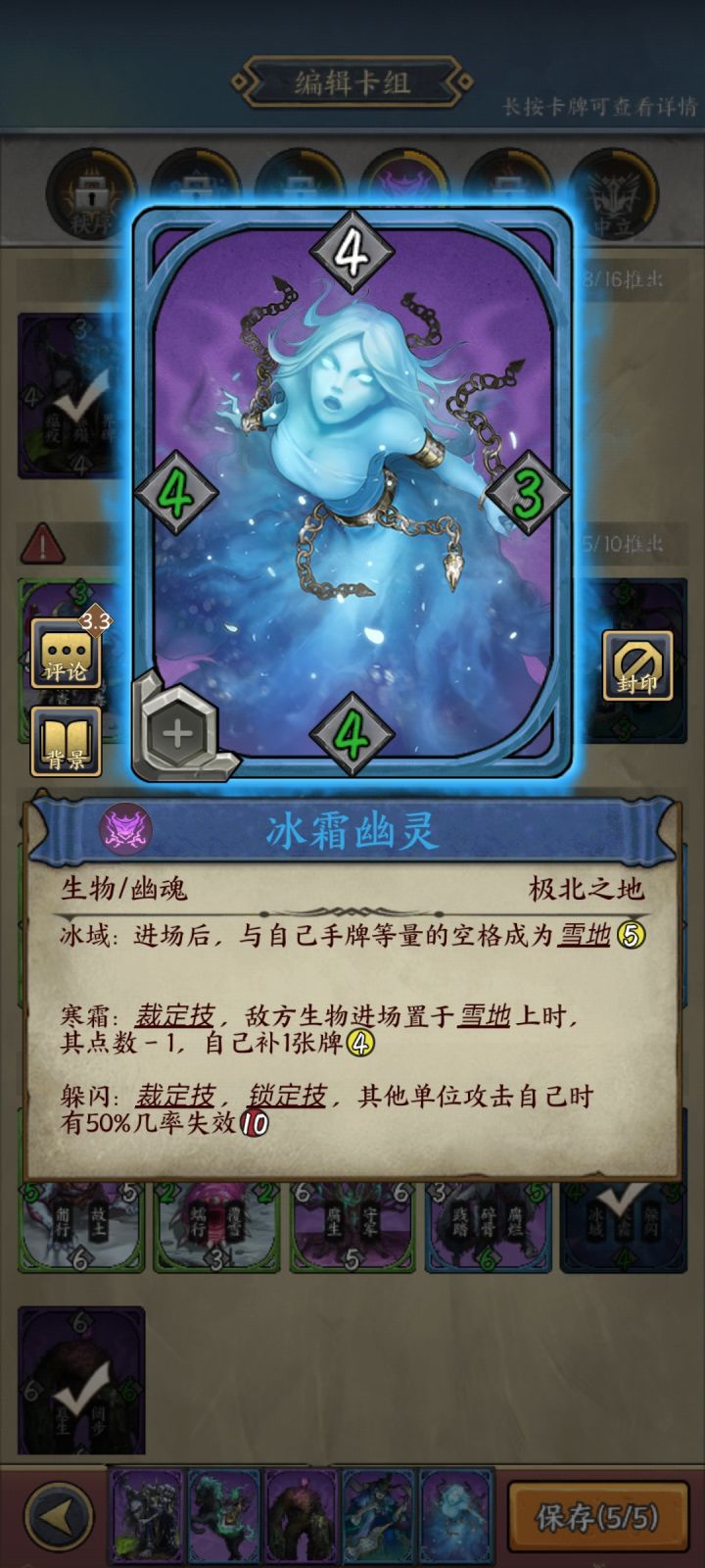 起手冰霜幽灵,放到角落里,雪地铺场,通过技能补牌第二张有两种打发思路,一种是保护冰霜幽灵的玩法: 幽冥判官或者天灾行者放到冰霜幽灵旁边。如果对手也是恐惧流就上幽冥判官,如果对手是其他的就上天灾行者【天灾行者打补牌流有奇效】另一种是上行墓巨人杀器械,通过墓生召唤骷髅占场后面的牌就随机应变了,不过最好从地图的一边开始放,每张牌互相紧挨,保护好内部的冰霜幽灵。解场的话主要靠幽冥判官的判罪,无视