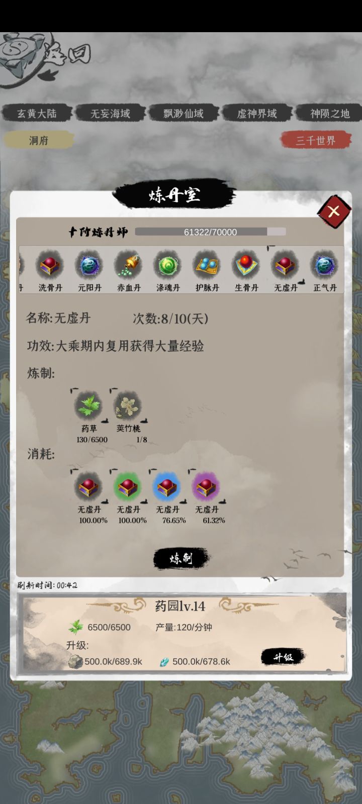 1.炼丹可以提升丹药成功率,炼丹需要药草和地图出的药材(药材地图就能爆)每次炼丹会根据丹药品质给出经验,经验丹药一天可以吃十个同境界的,这个尽量每天吃紫色,属性丹(攻防血)只能吃十个所以必须吃紫色。2.药园产出草药的地方可以升级(升级需要后山产出的资源)增加每分钟产量和储存上限(等级不需要太高够用即可)3.后山产出三种升级药园,悟道室和器灵的资源,升级后可以提高每分钟产出数量和储存上限,