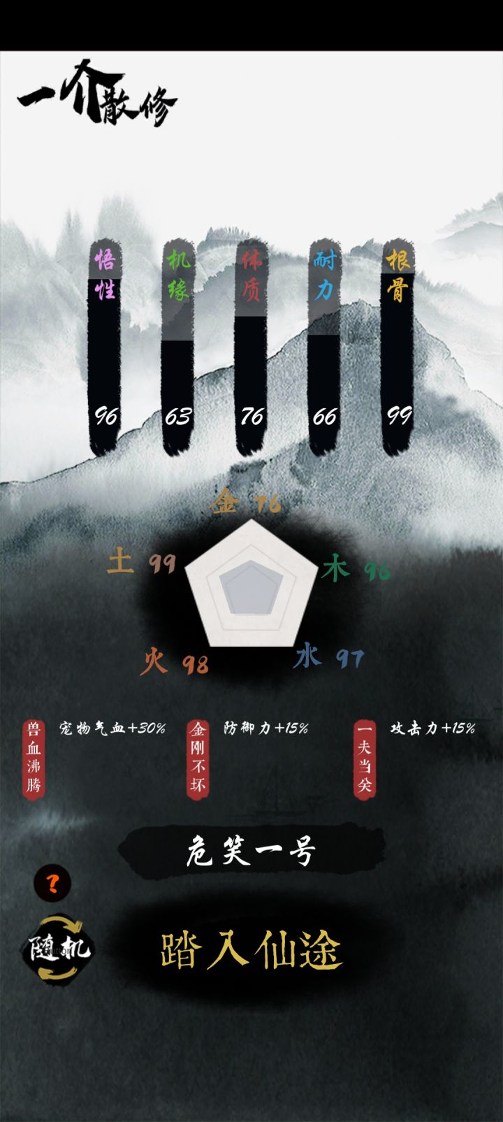 开局刷天赋,五行攻击可以先忽略,看根骨耐力体质。80以上就可以开,尤其是耐力根骨,影响防御攻击。体质低一点没关系,但也别太低。天赋方面,攻防血或者攻防法则。这两种比较适合,法则走后期路线,攻防血走前期。法则加成比天赋高得多。开局抽宠物,狼,龙这两个主流上阵。到等级抽天命签,抽经验上上签能加15%经验加成(要经验加成,宠物的修为的都没啥用)然后就玩就行了。调难度增加经验获取,但是一点难度怪物增