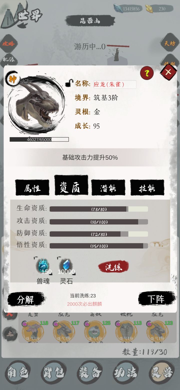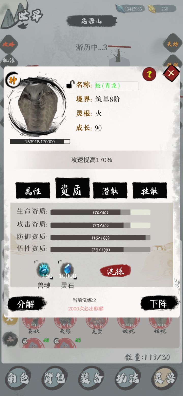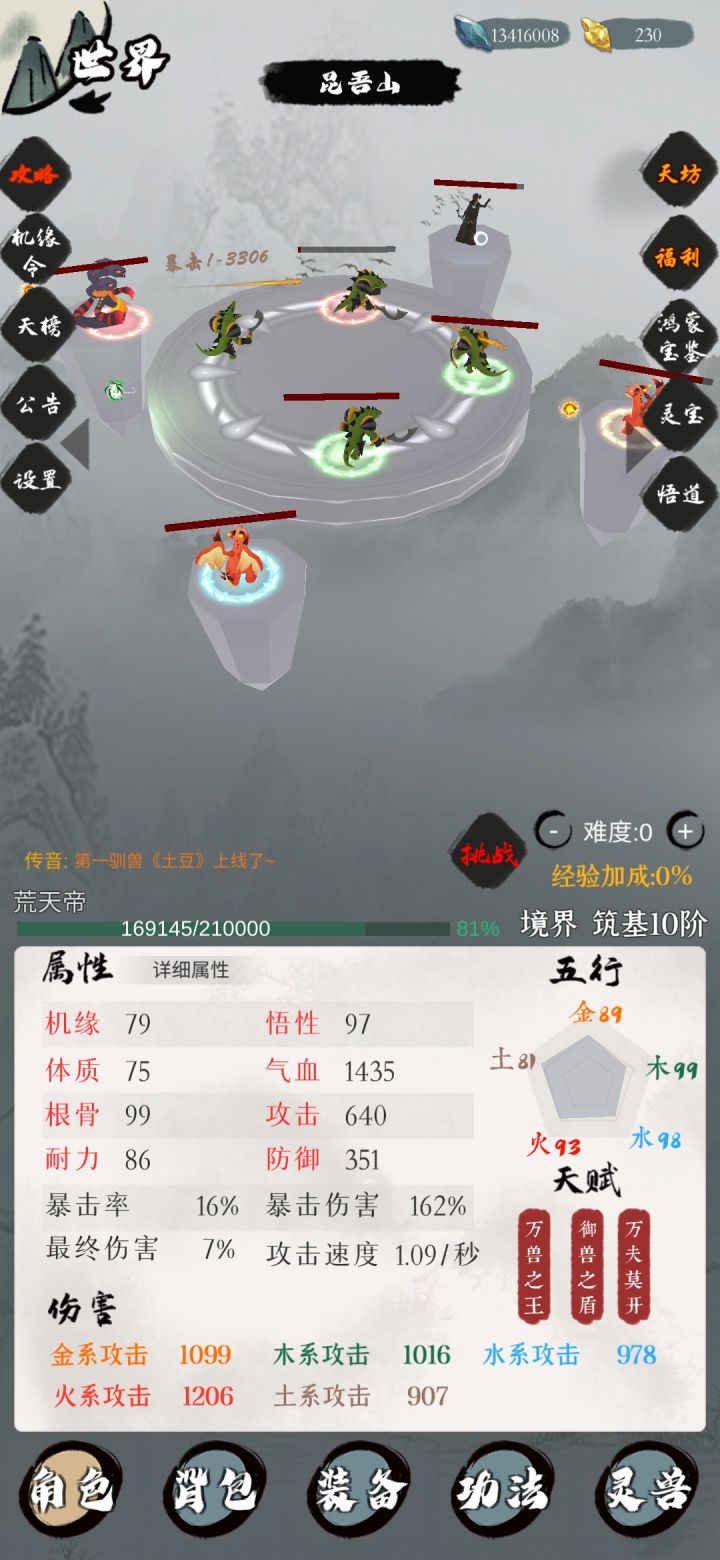 开局须知(2022.9.17大更新):1.资质: 悟性:影响角色修炼速度机缘:影响物品掉落体质:影响角色气血耐力:影响角色防御力根骨:影响角色攻击力初始最高值为99耐力和根骨优先2.五行:影响五行伤害,初始最高值为993.天赋:分以下三种流派进行推荐1.人物流(主要培养人物)2.御兽流(主要培养灵兽)3.人兽流(啊呸,双修流)注意:1.天赋一旦选定,不可更改2.