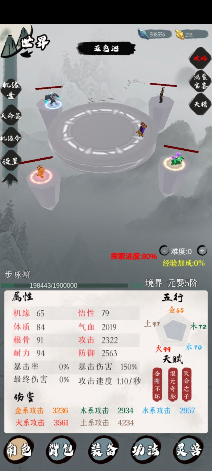 五维里,体质完全可以忽略,其次机缘五行里,土属性可以忽略,因为土特效是boss百分比扣血天赋方面,红色天赋修炼速度,灵石掉落,完全没用不存在血牛,防御非常重要,是加算,防御跟不上,boss刀刀真伤