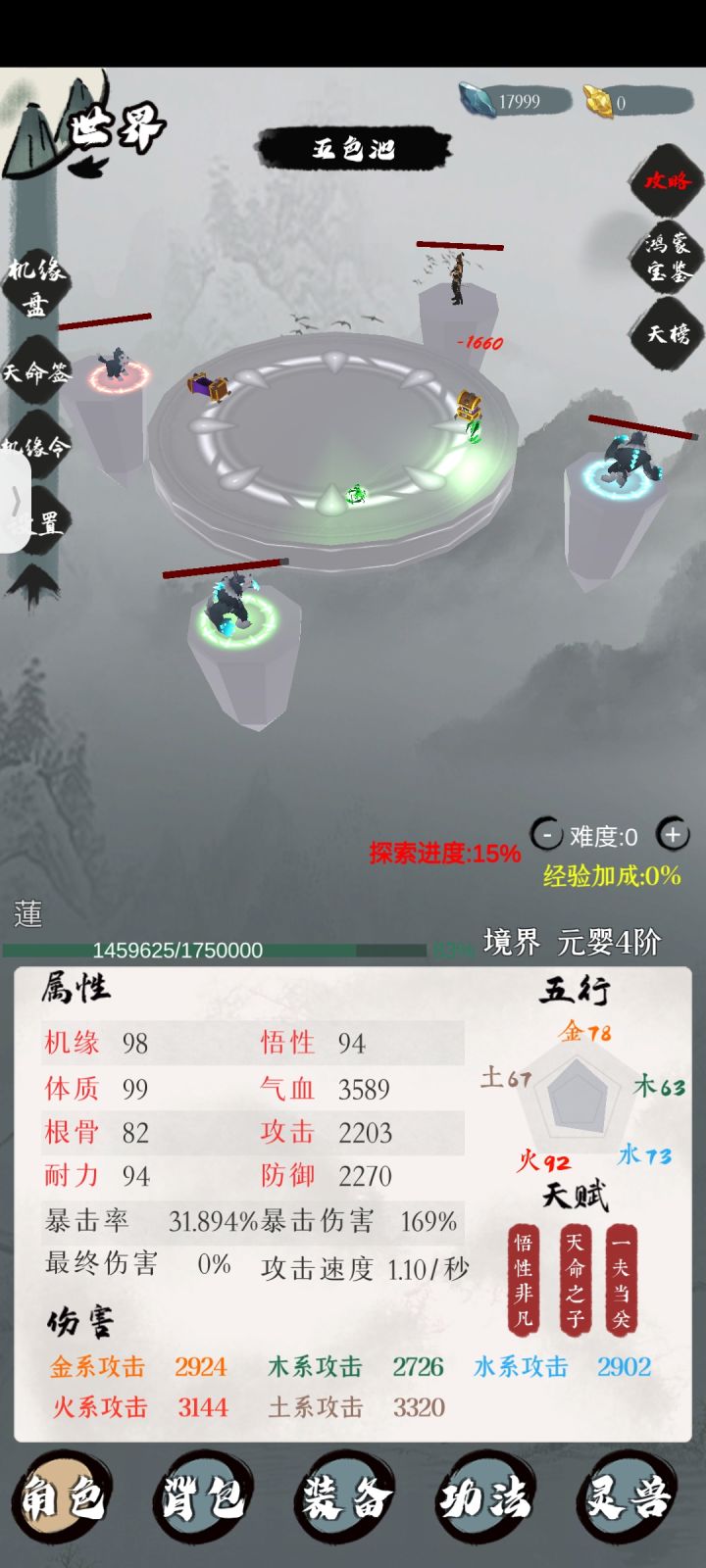 仨橙色天赋 属性70+就开的局 一直看群里说要刷属性刷属性 我是第一批最早开始的 一开始上元婴进度还能跟上 今天搁五色池卡了一天了 元婴6现在 想了想还是重开了 准备长玩下去这游戏 但是目前的天赋实在太差了 被同时长落下太多了 各位入坑新人一定要刷到防御力15%那个天赋啊防御太重要了